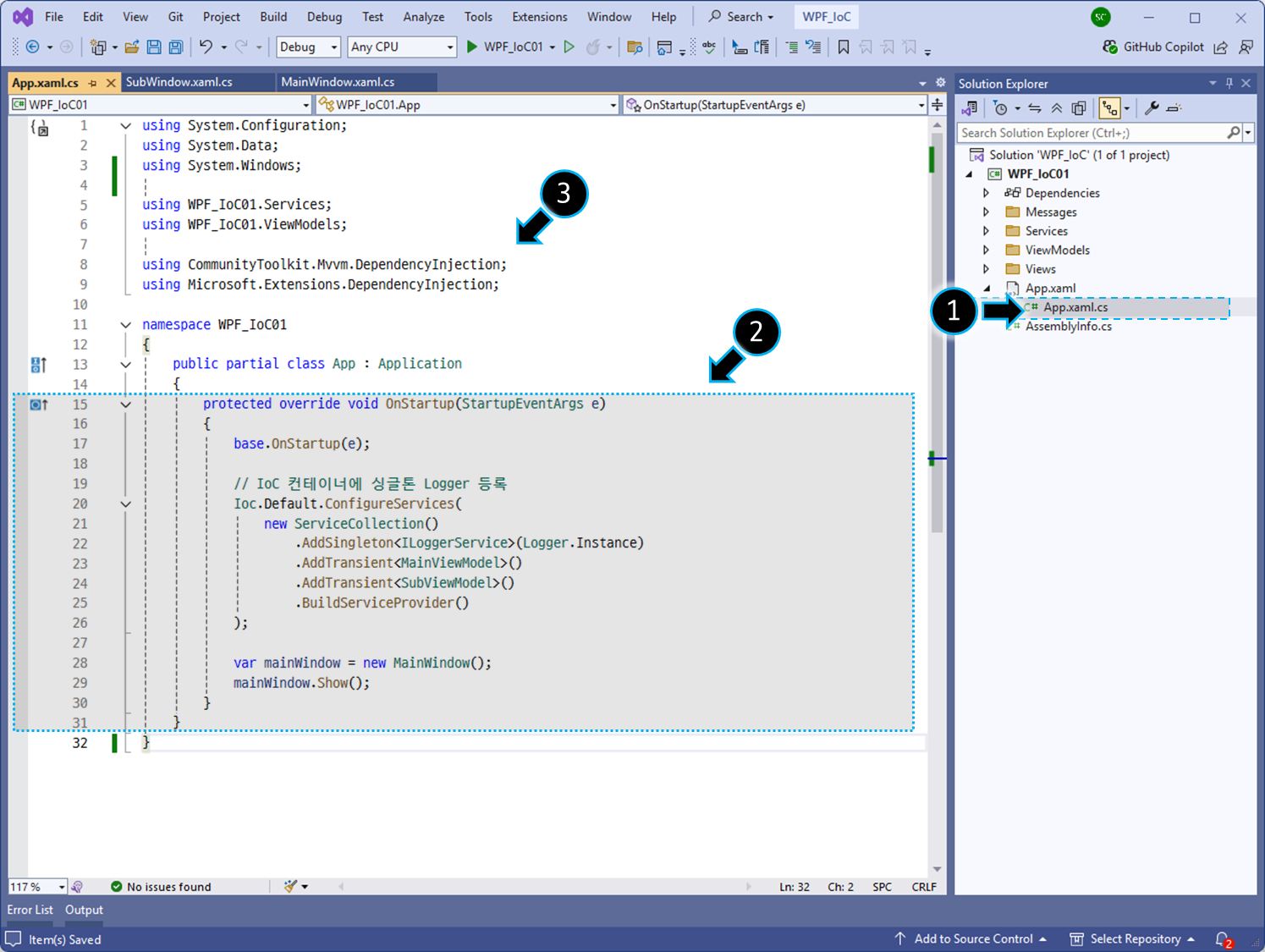 //    └── App.xaml.cs              ← IoC 컨테이너 구성