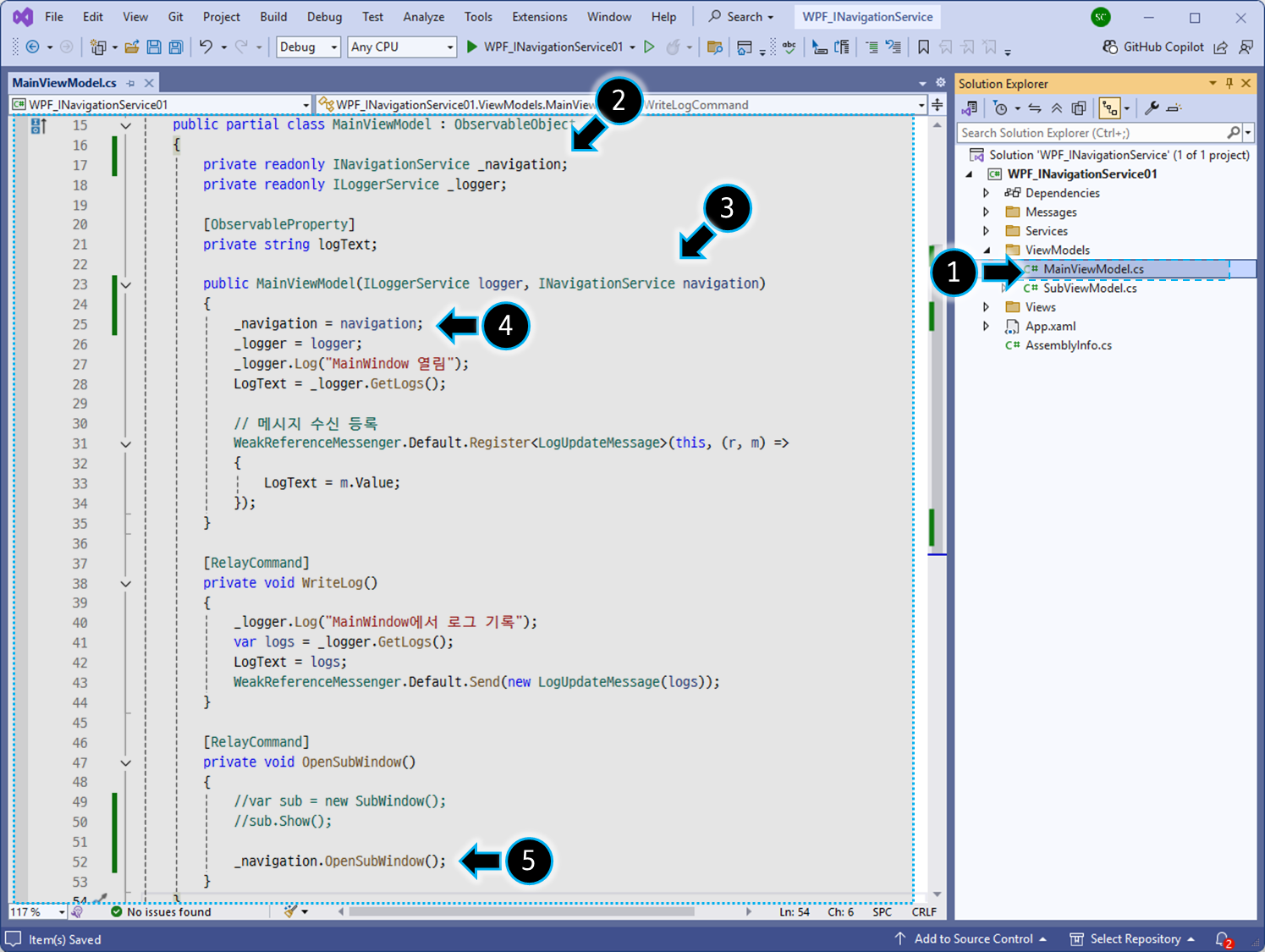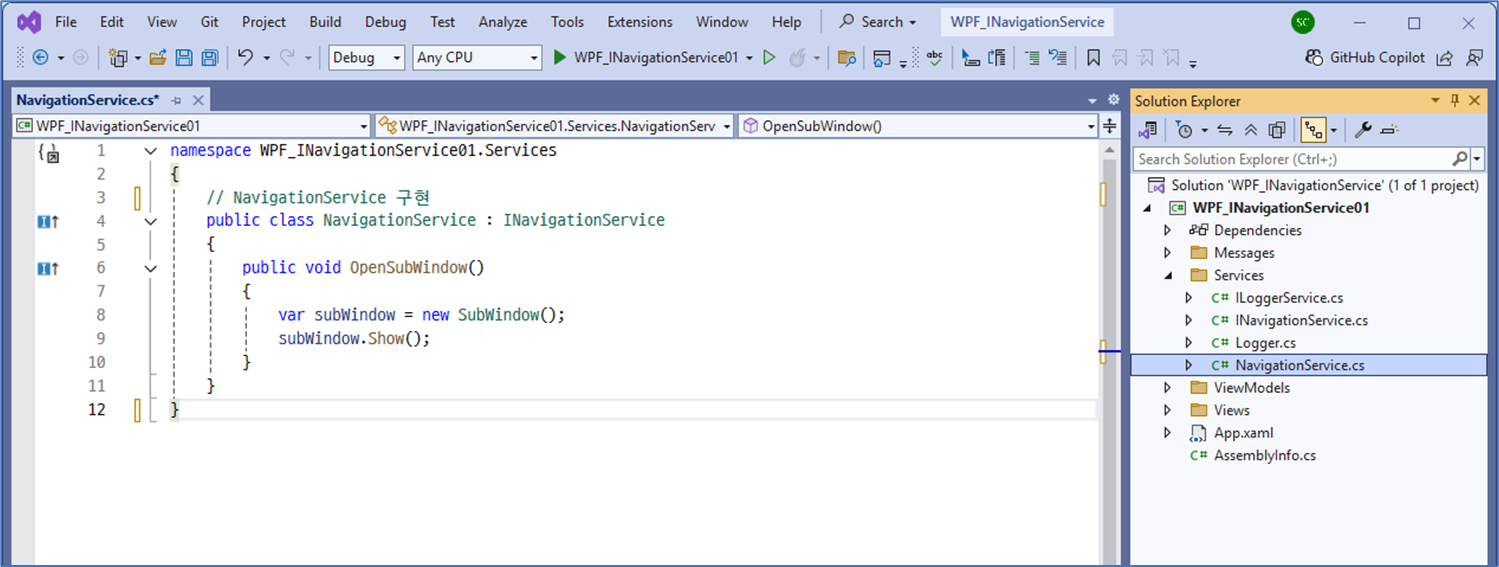 • 이렇게 하면 ViewModel은 UI(Window)를 직접 알 필요 없이 Navigation 요청만 수행하므로 MVVM 원칙을 더욱 충실히 구현