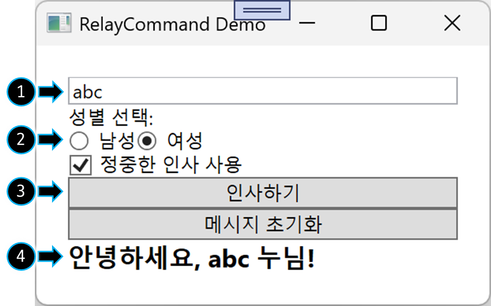 <Button Content="인사하기" Command="{Binding SayHelloCommand}"/>