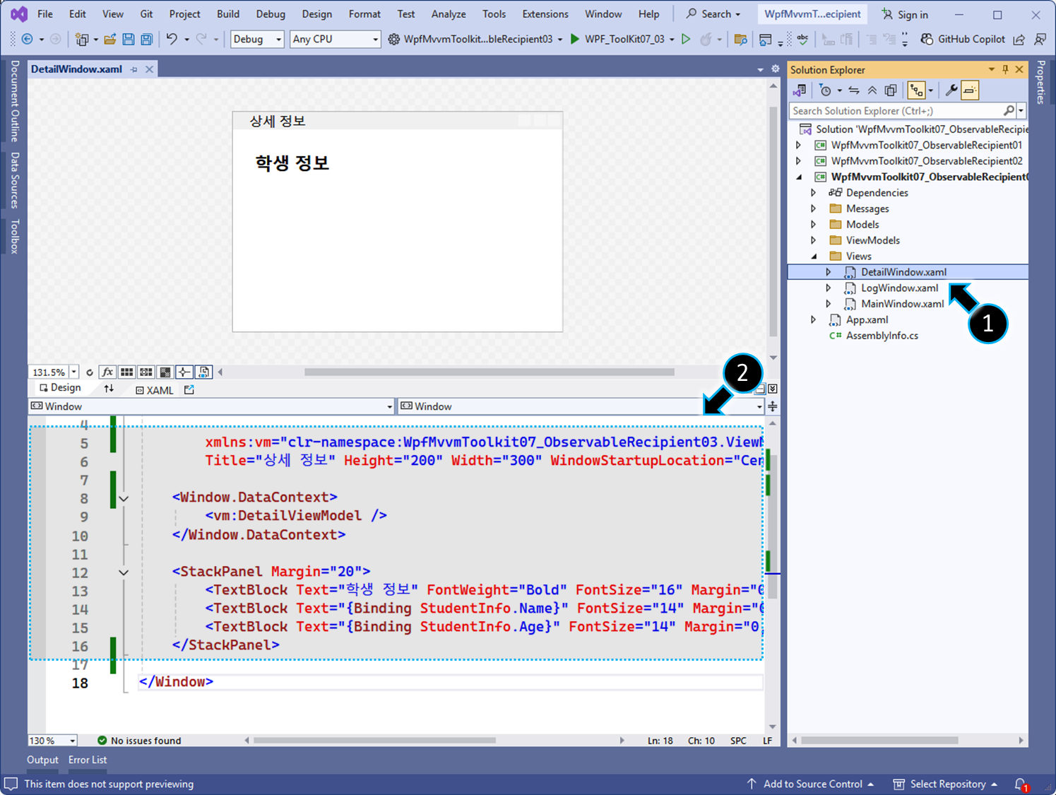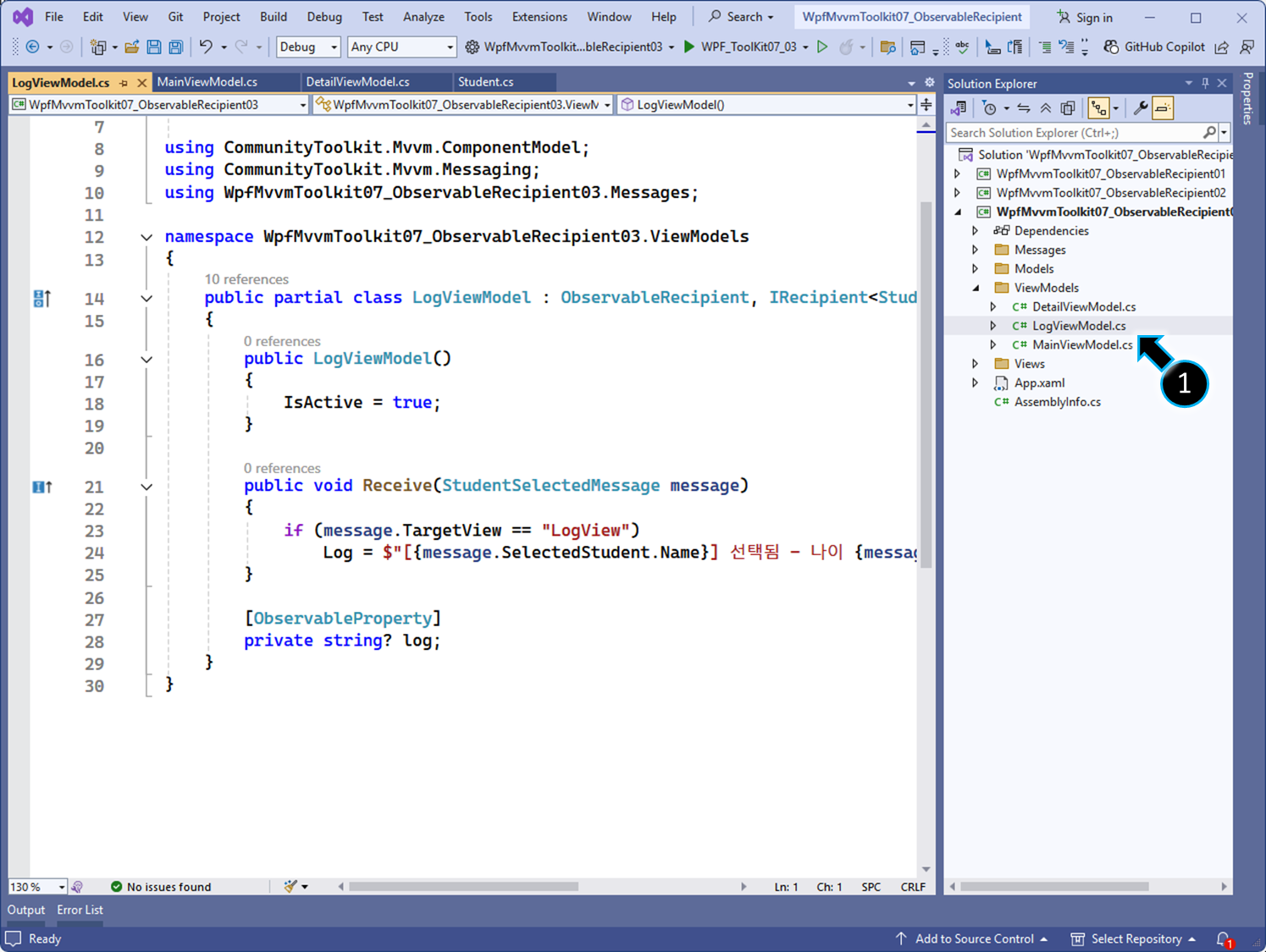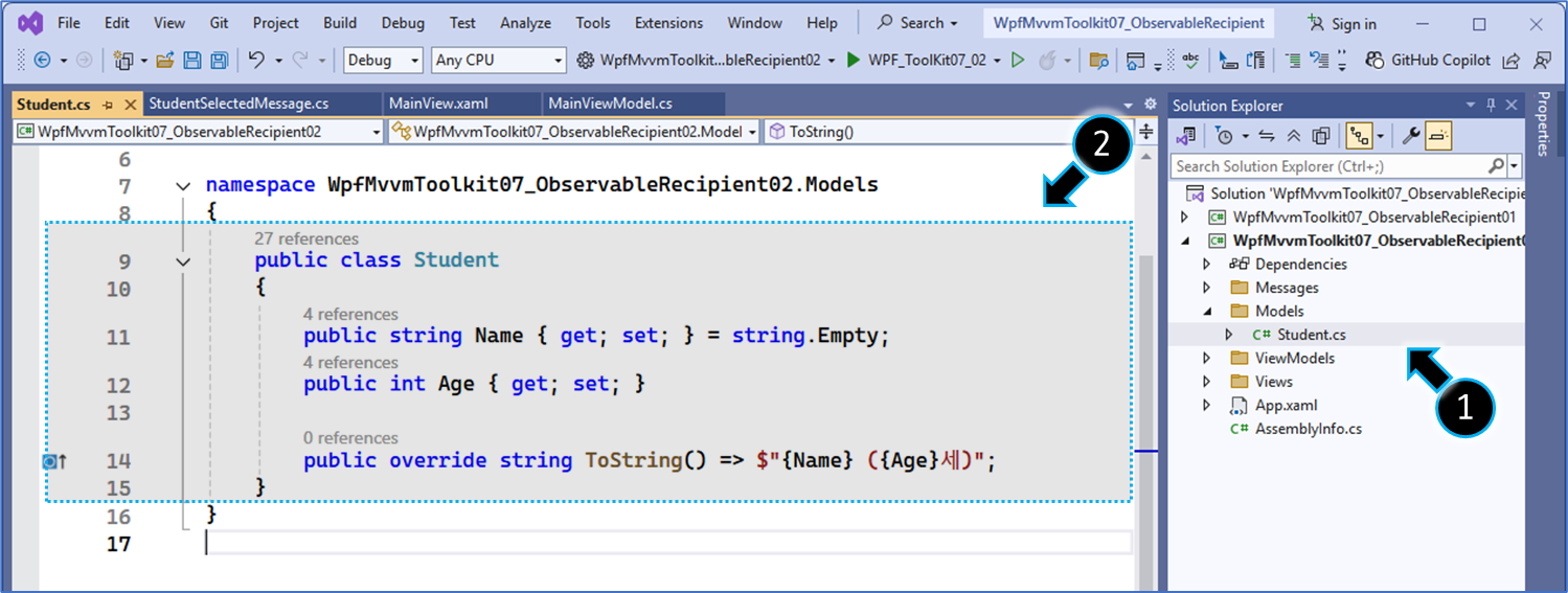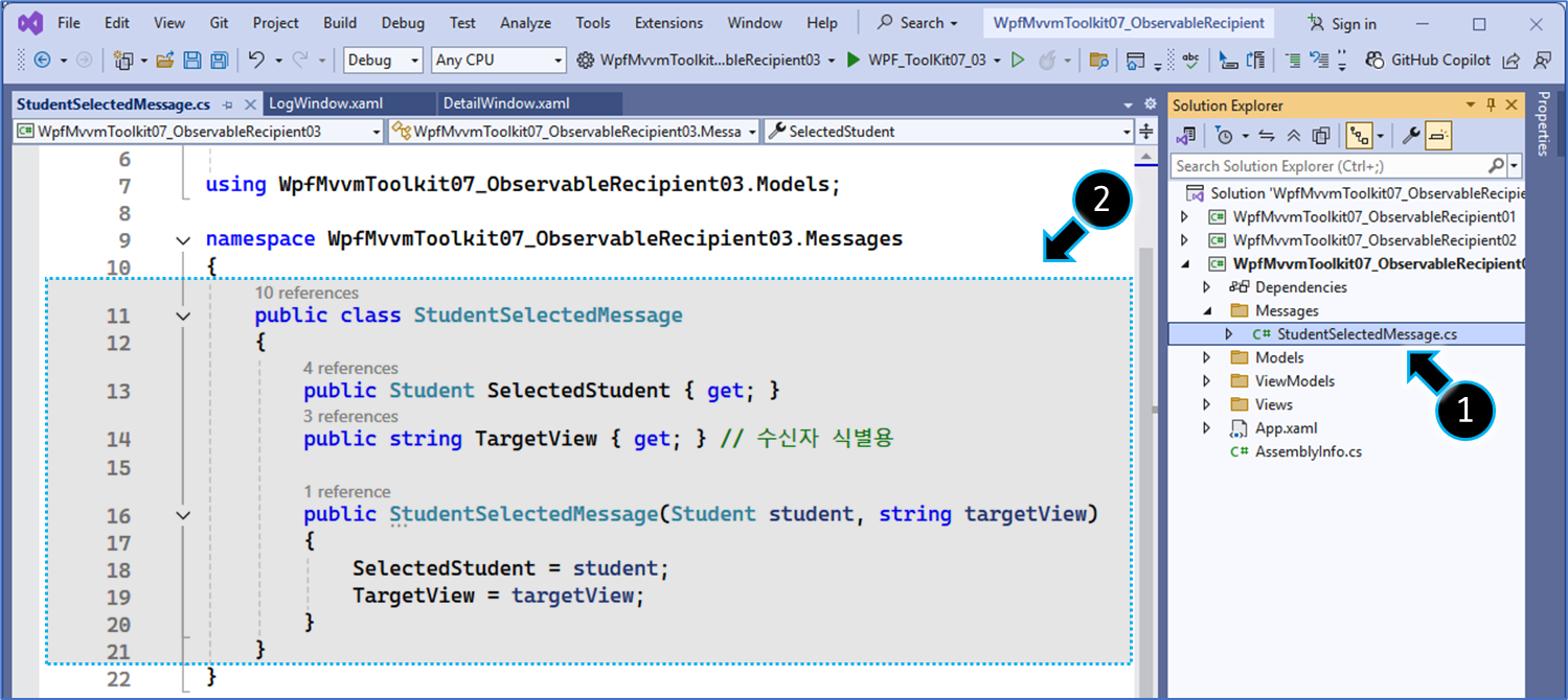 // 특정 메시지를 받기 위해 IRecipient<StudentSelectedMessage> 인터페이스를 구현합니다.