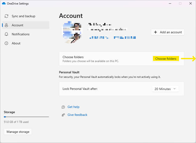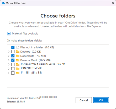 - Choose folders : OneDrive 에서 Local PC 로 동기화 할 폴더를 선택한다.