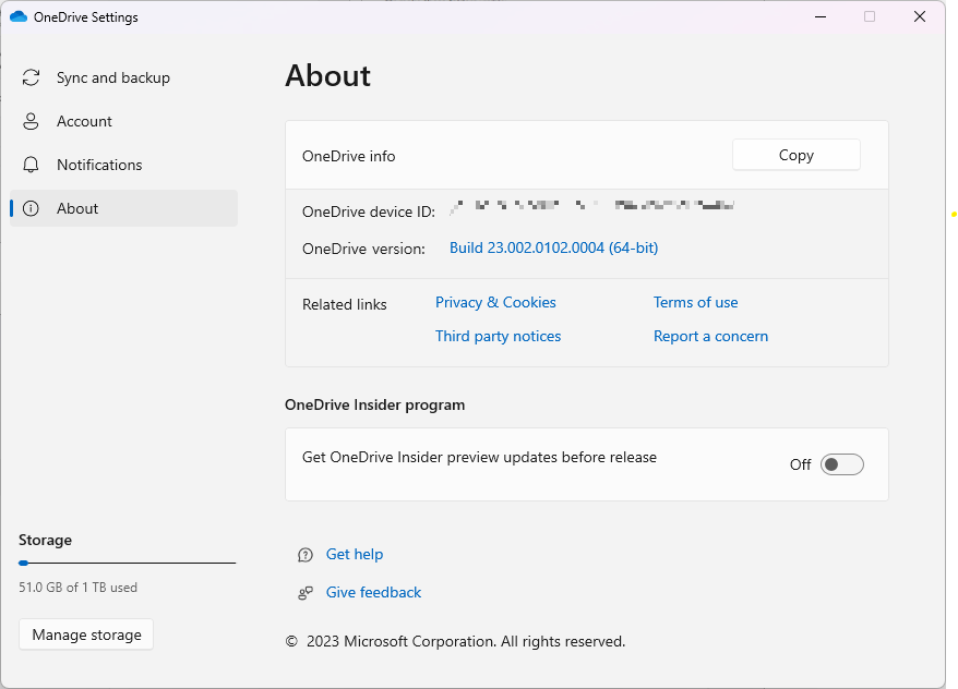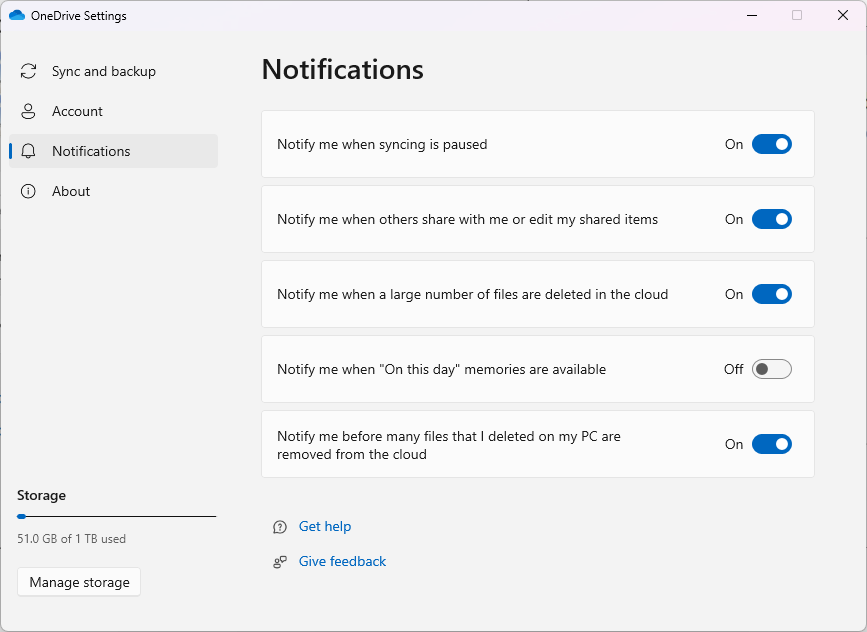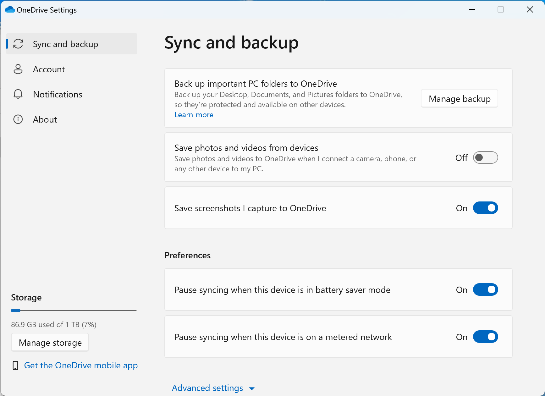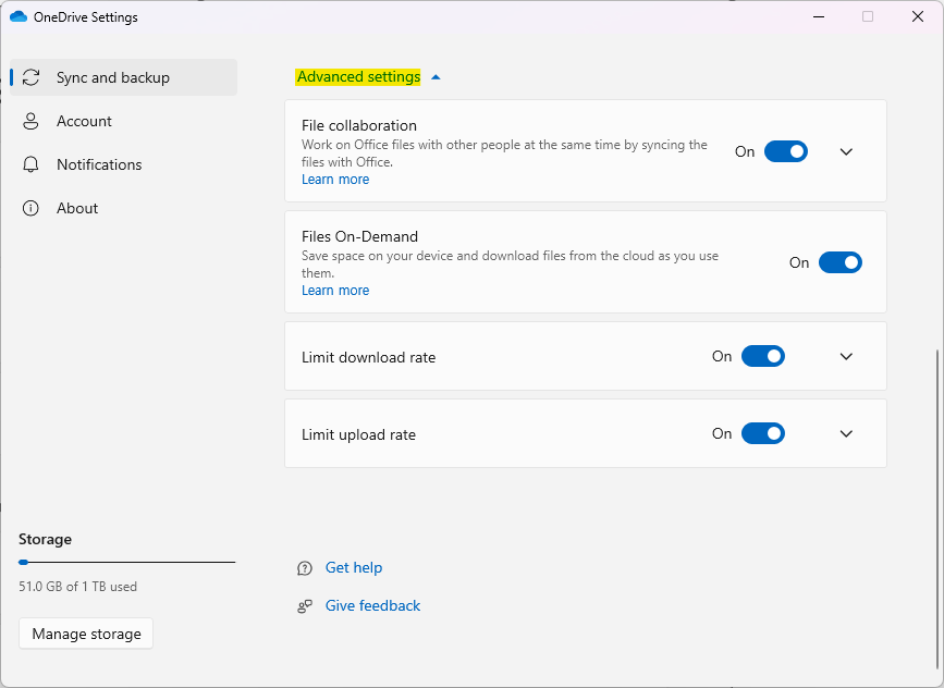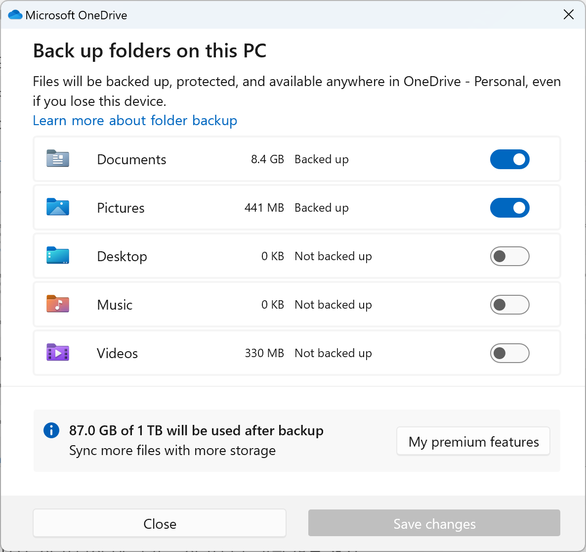 - Manage backup : Local PC 에서 OneDrive 로 동기화 할 폴더를 선택한다