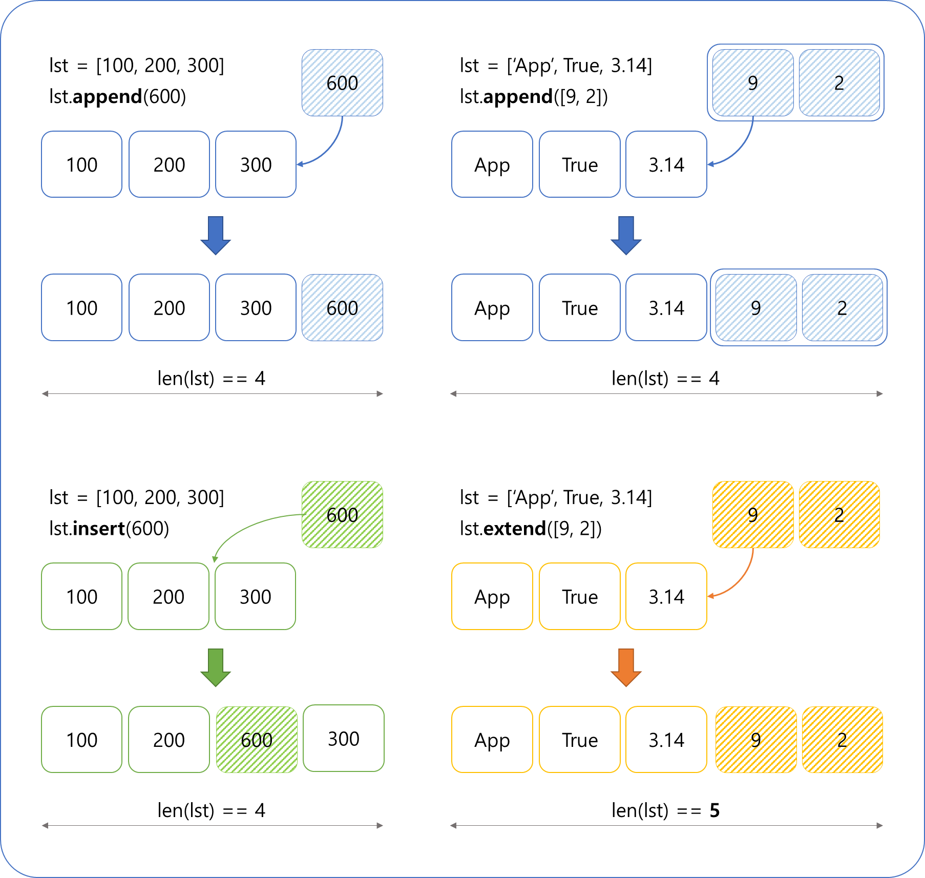 - extend(요소): 리스트를 연결하여 확장
