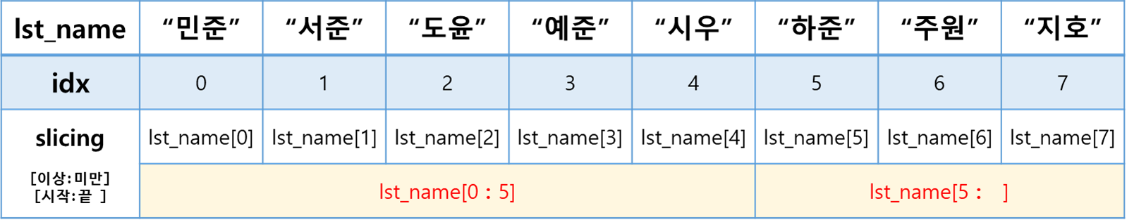 lst_name = ['민준', '서준', '도윤', '예준', '시우', '하준', '주원', '지호']