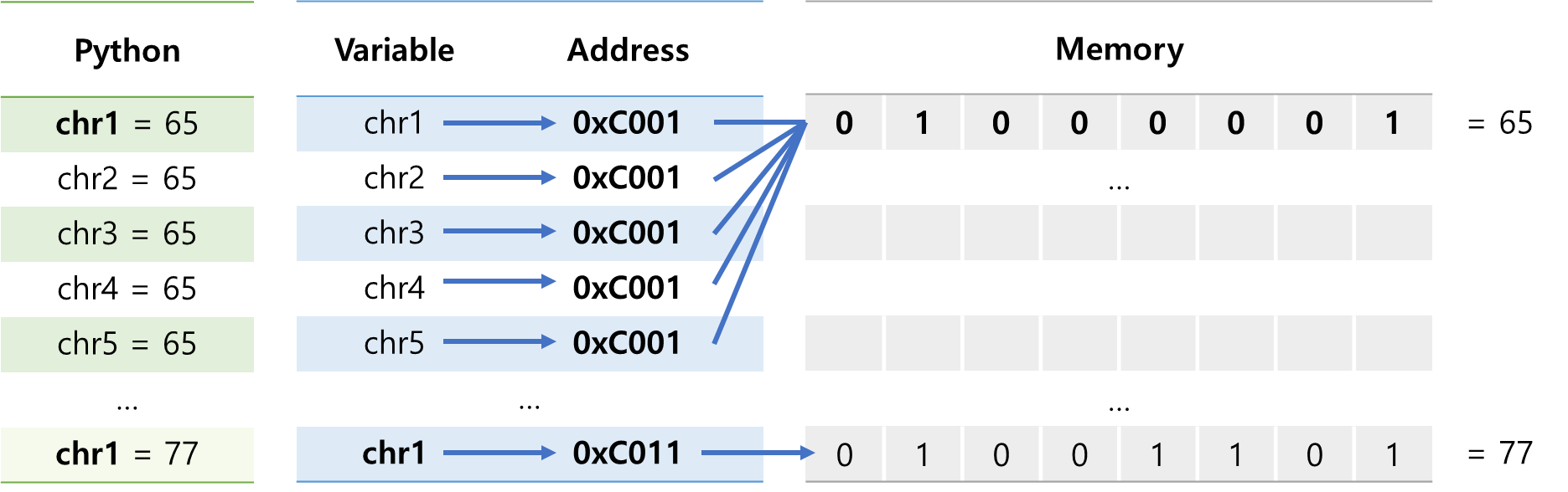 *리스트 > 메모리 주소 > 리스트 요소의 메모리 주소 > 2진수(실제 저장된 값)