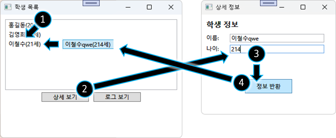 - 상세 보기 버튼을 누르면 DetailWindow 에서 선택한 학생의 상세정보와 함께 실행됩니다.