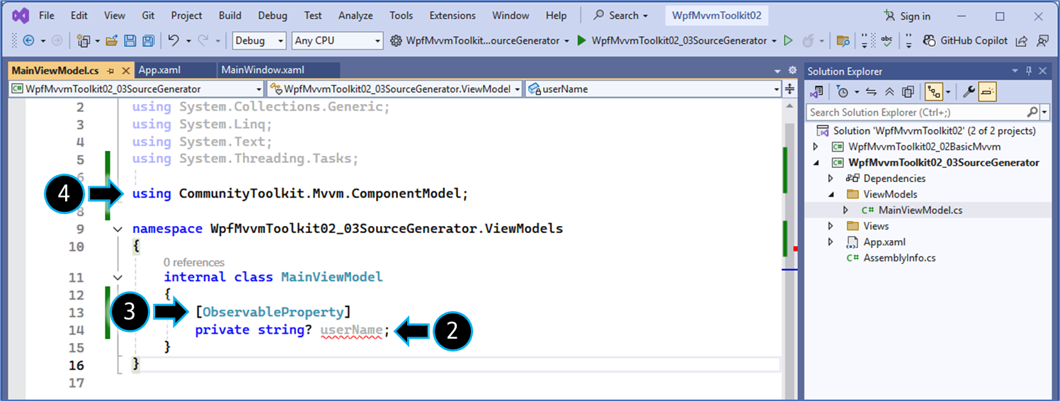 ③ userName 필드 상단에 [ObservableProperty] 어트리뷰트를 추가하면,