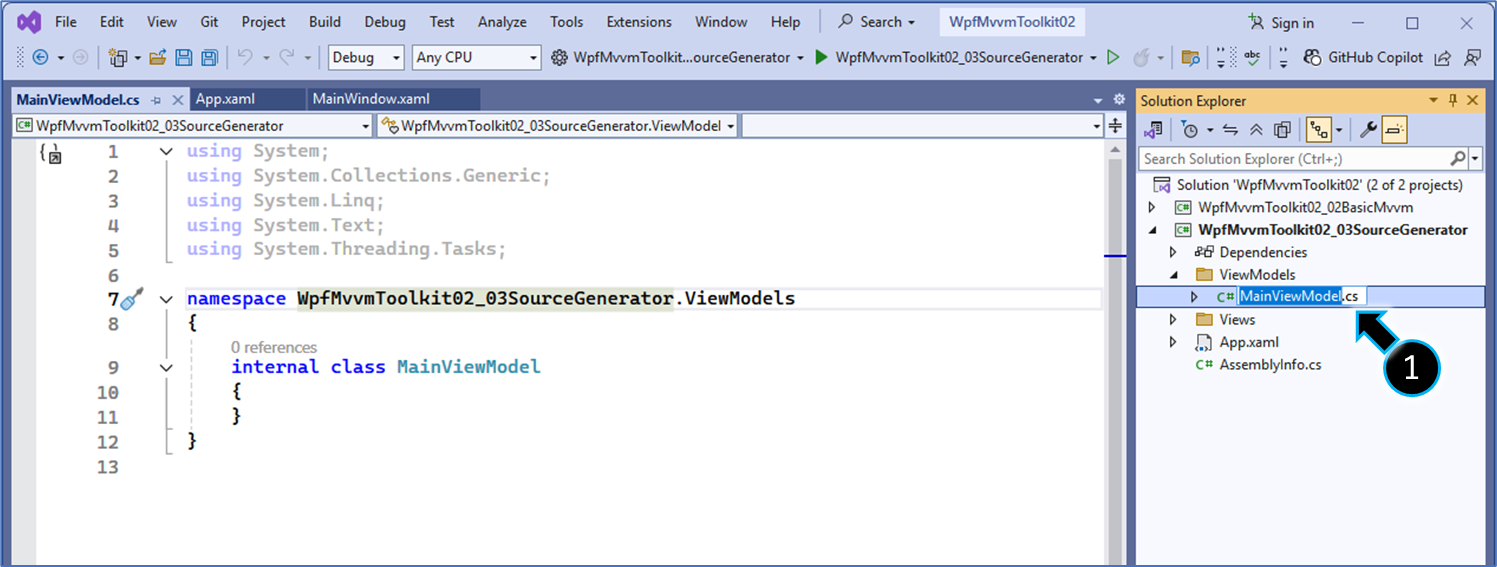 ② 솔루션 탐색기에서, MainViewModel.cs에 자동완성된 On___Changed 함수를 더블 클릭합니다.