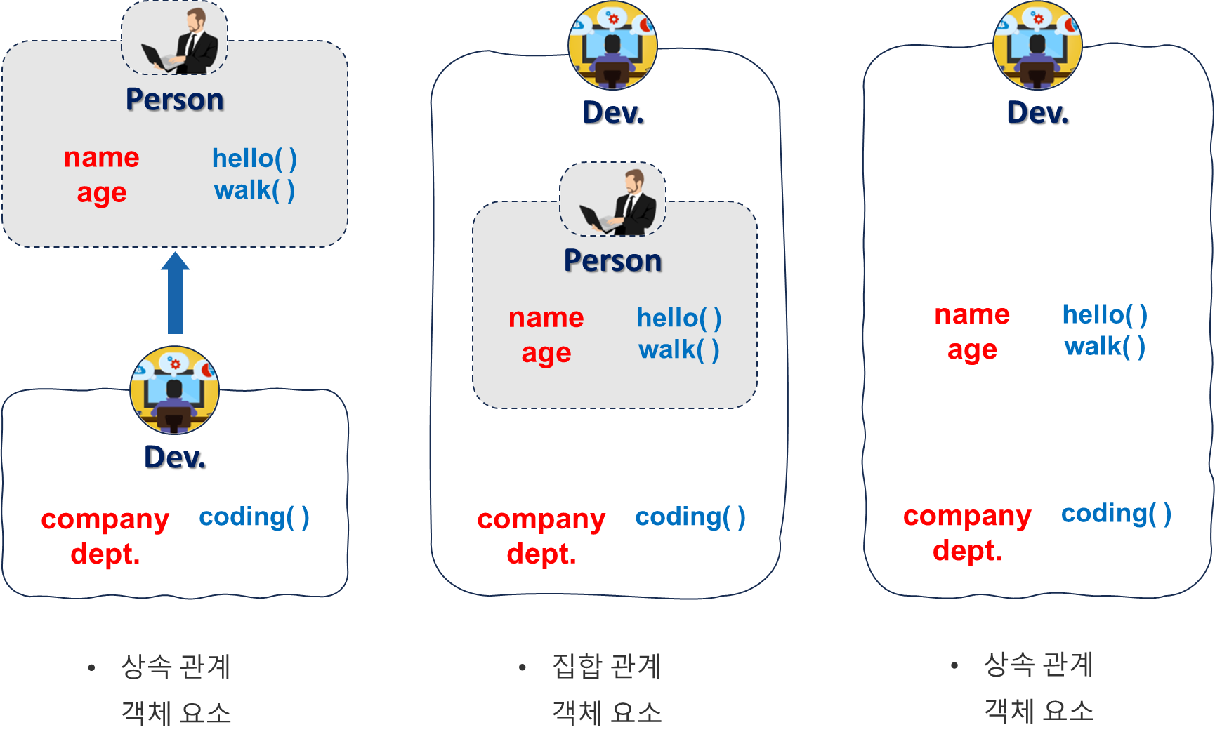 부모 객체의 속성 없이 존재할 수 없습니다. - 이를 하위 객체인 Programmer, Dancer, Dog, Iguana 등의 객체가 "상위 객체에 의존한다"고 표현합니다.