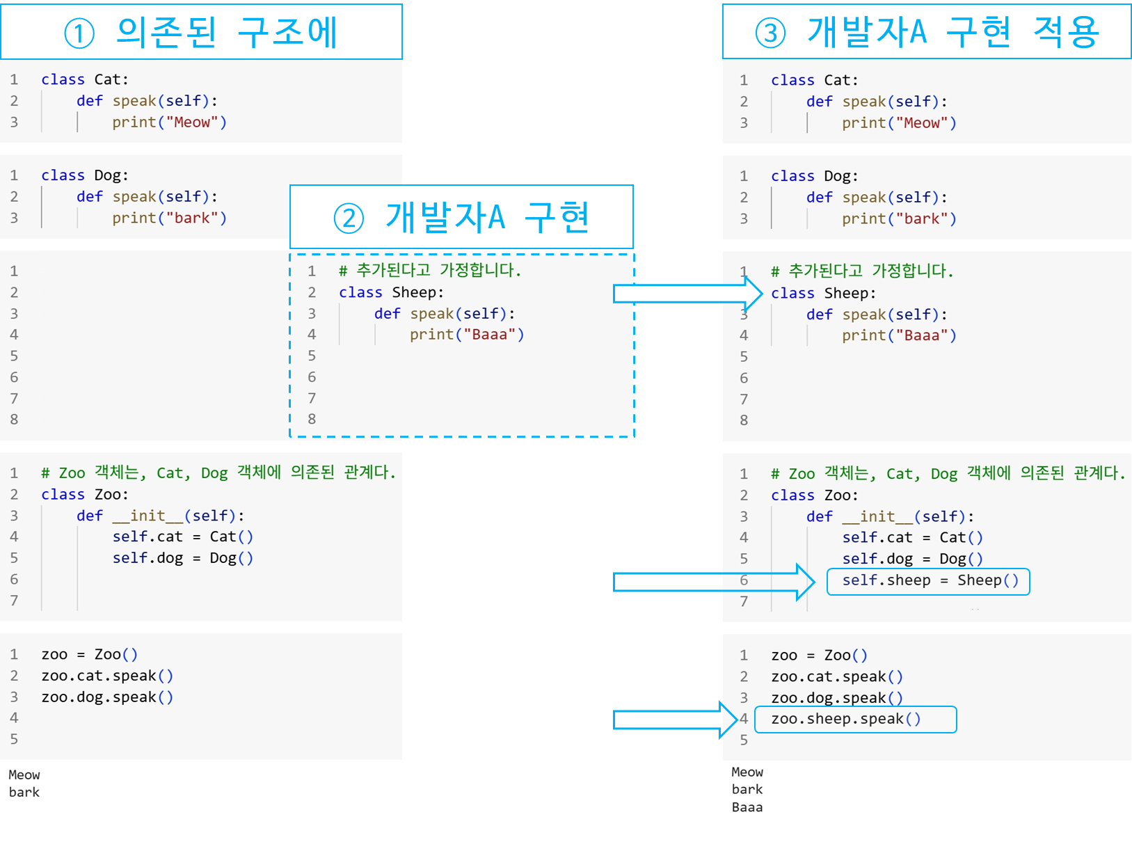 >> Zoo도 영향을 받음 - 다른 동물 추가와 같은 코드 확장 시,