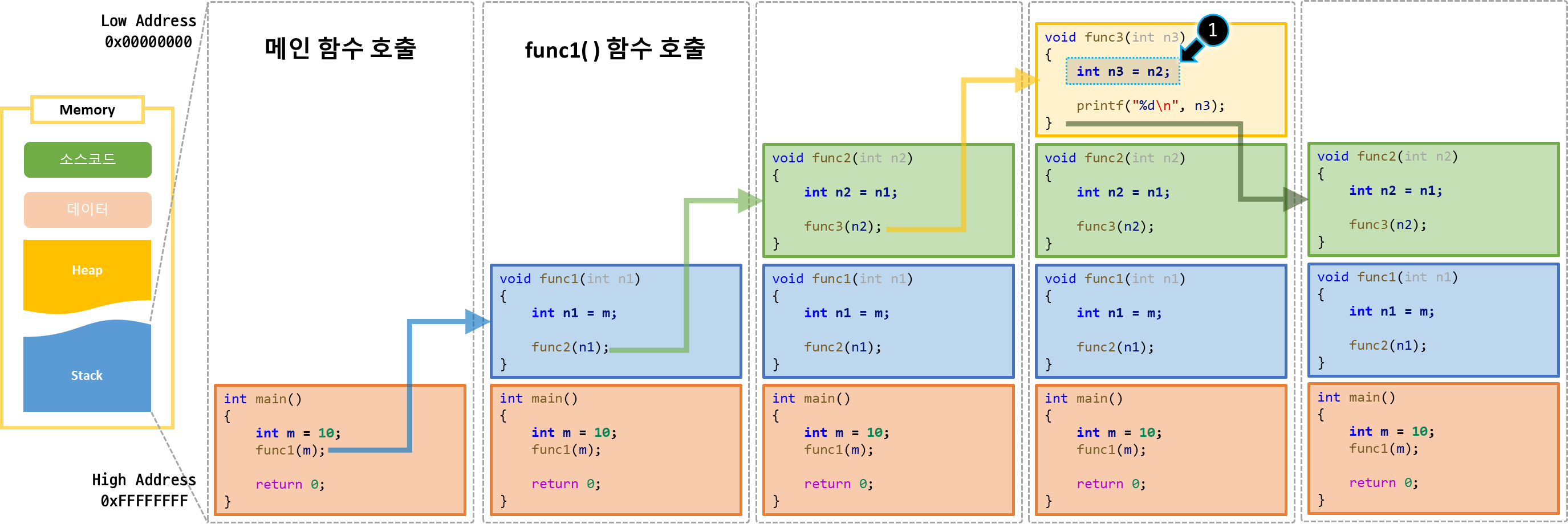 1. main( ) 실행 → 2. func1( ) 실행 → 3. func2( ) 실행 → 4. func3( ) 실행 →