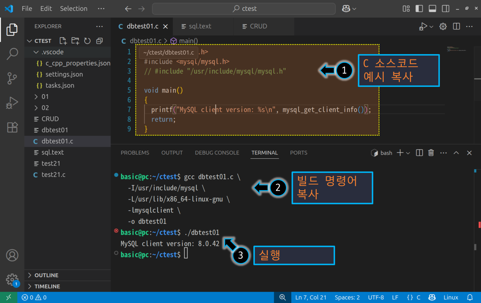3. mysql.h 라이브러리 포함, 빌드 명령 방법