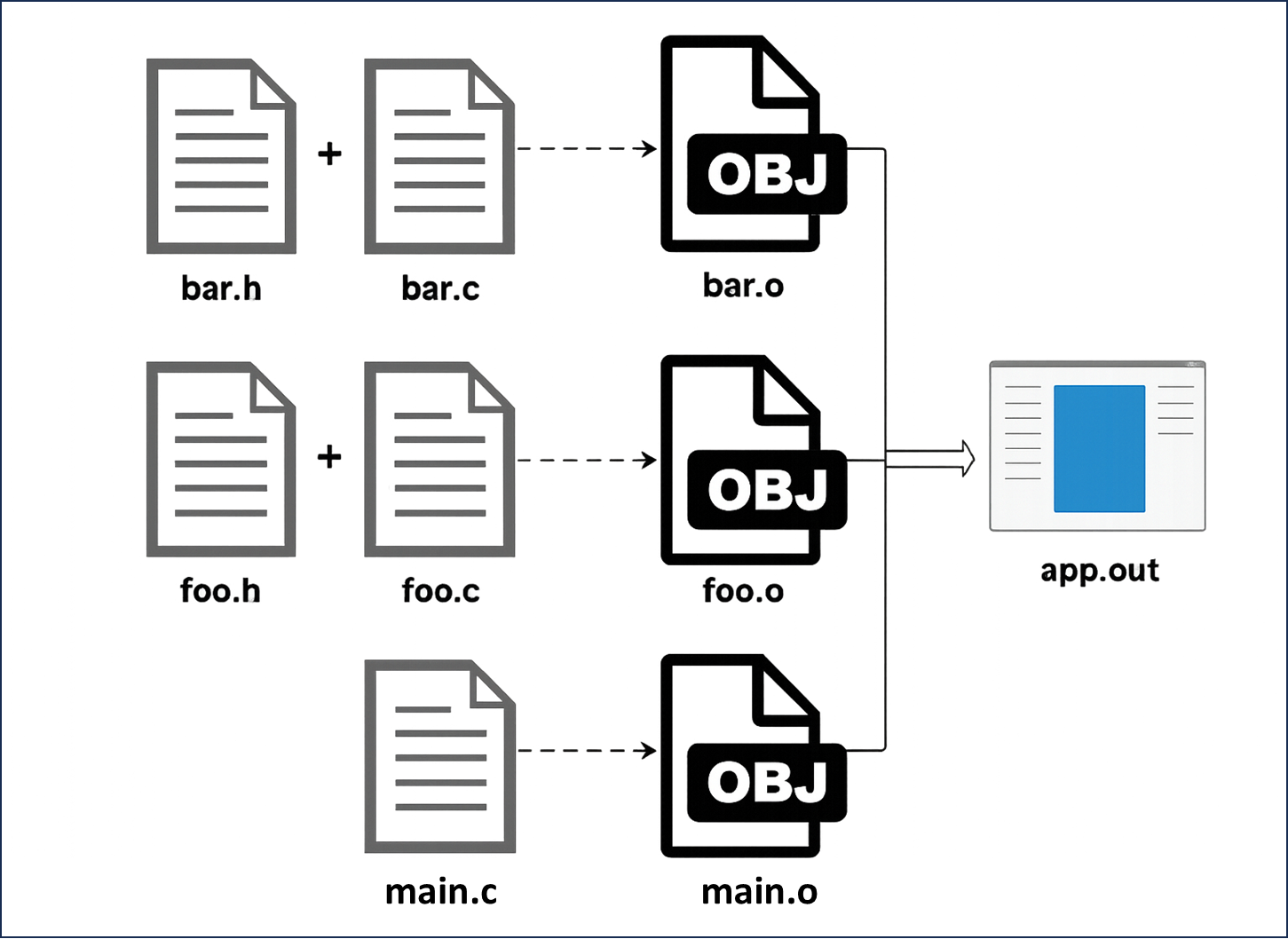 gcc main.c foo.c bar.c baz.c qux.c -o program -lmysqlclient -lpthread - 특정 파일만 수정했을 때 전체 재컴파일 비효율
