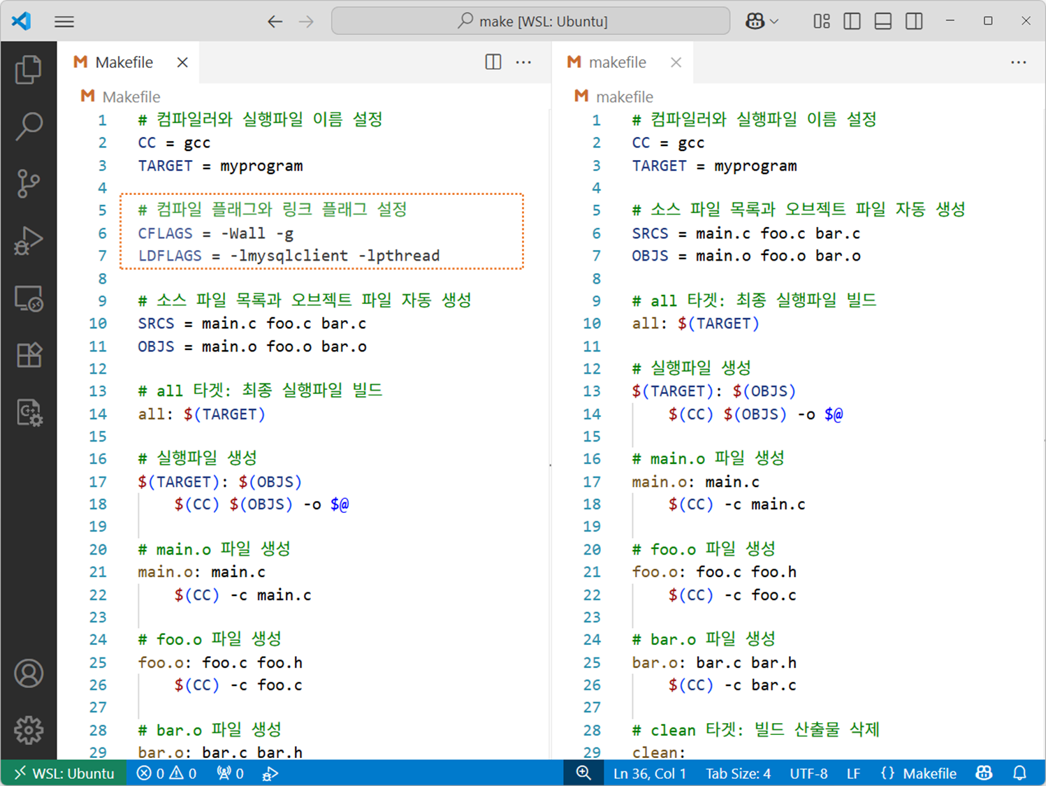 - CFLAGS: 컴파일 옵션을 변수로 정의 (-g : 디버깅 심볼 포함, -Wall: 모든 경고 표시)