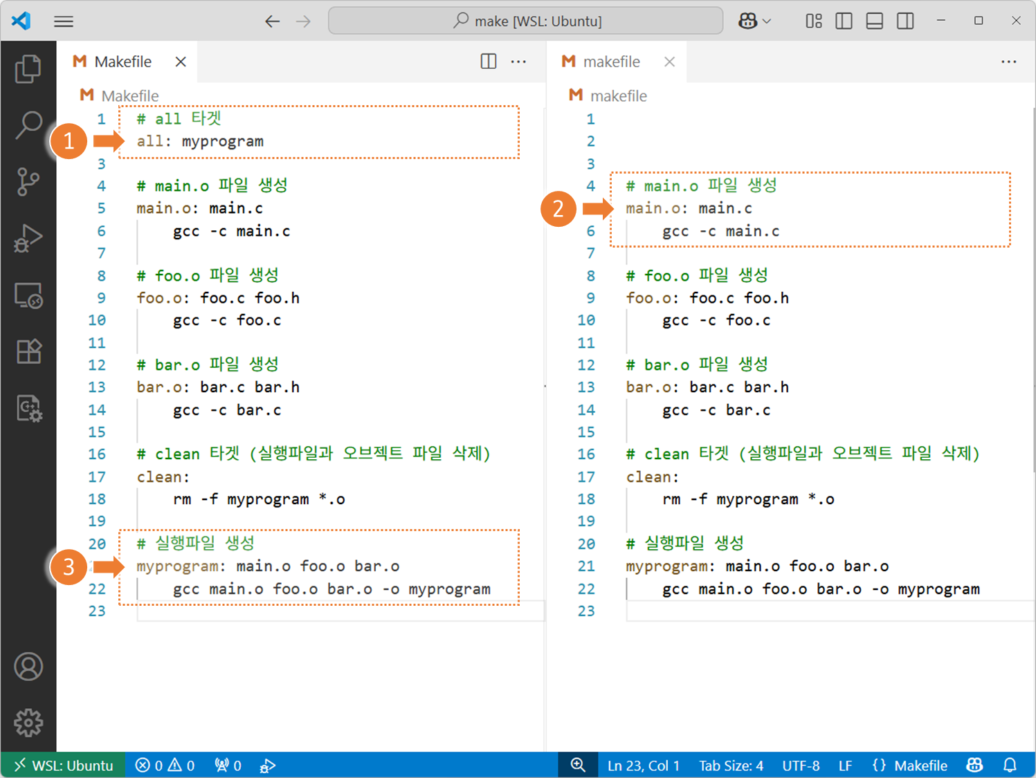 - all은 여러 하위 타겟(예: myprogram)을 의존성으로 가지고, 이들이 모두 빌드되어야 완료됩니다.