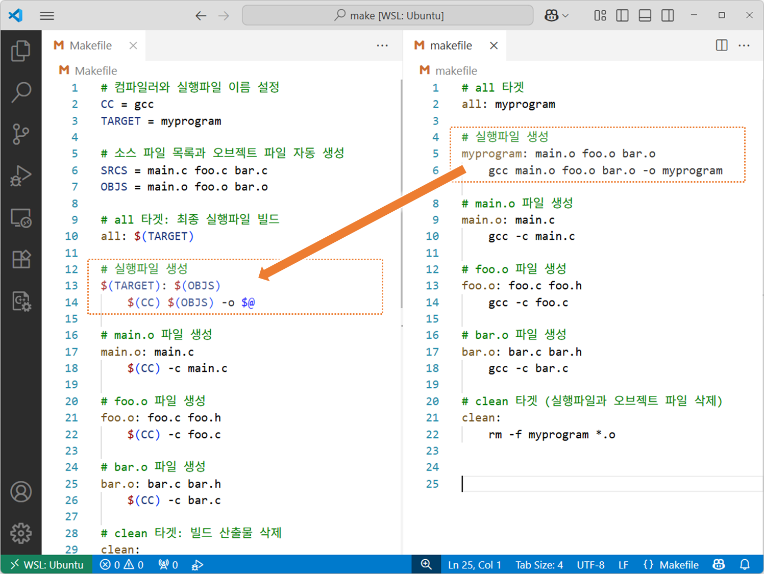 - $(OBJS) : 변수 OBJS를 참조하며, 예시의 main.o foo.o bar.o로 치환됩니다.