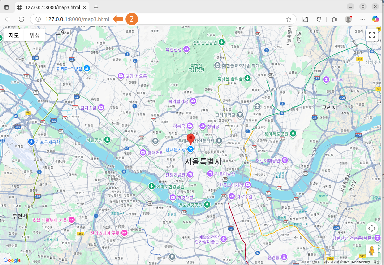 | HTML 소스 | http://127.0.0.1:8000/map3.html 를 네트워크로 가져옴 (서버에서 받아옴) |