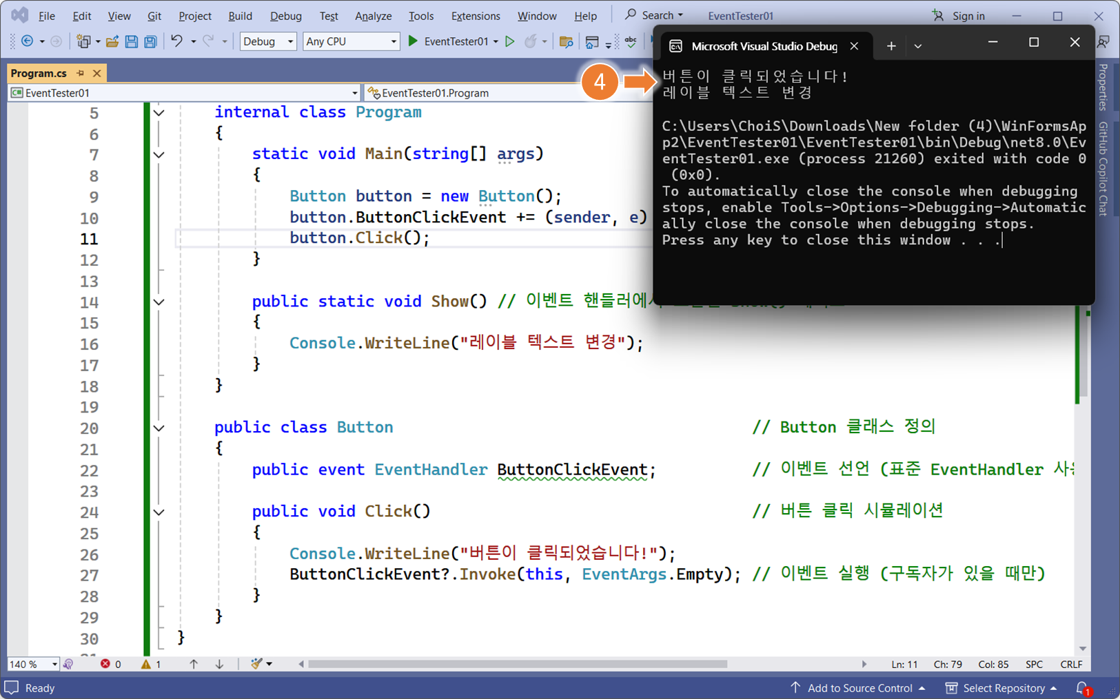 ❸ 내부에 EventHandler(대리자, 함수를 변수처럼 사용)에 ❹ 등록된
