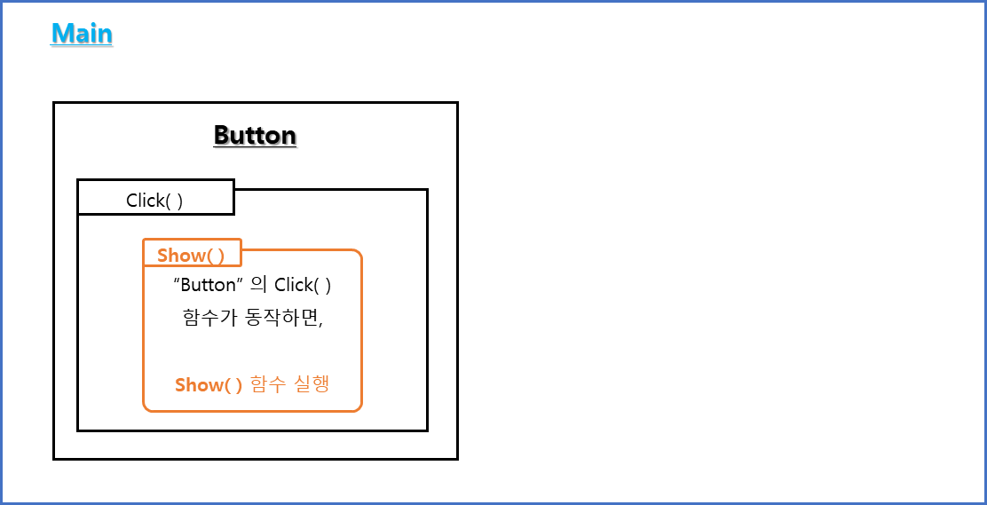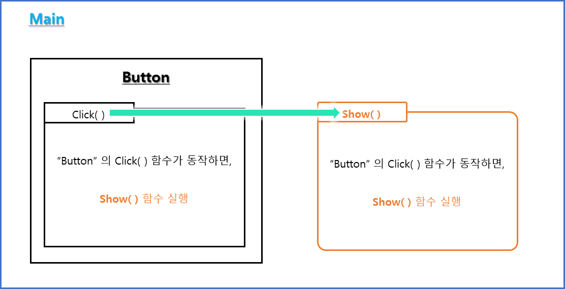 “Button” 의 Click( ) 함수가 동작하면, Show( ) 함수가 실행되도록 구현한다고 가정합니다.