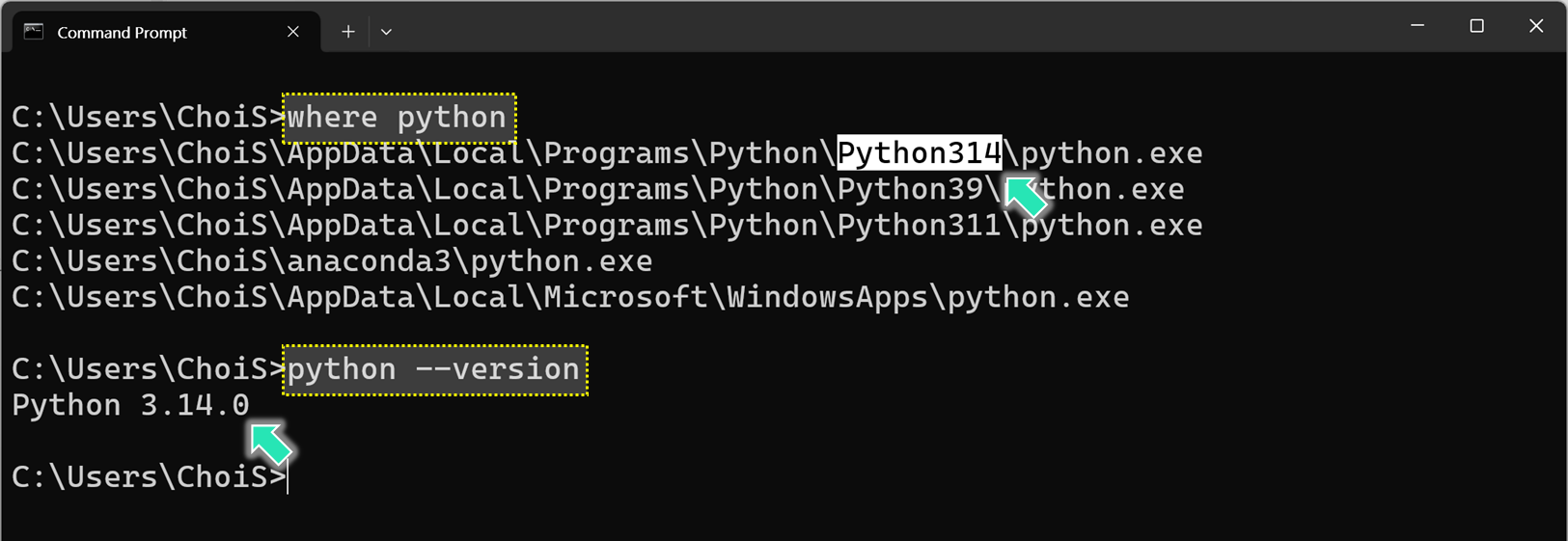 where python, python --version 명령어의 결과가 달라짐을 확인할 수 있습니다.