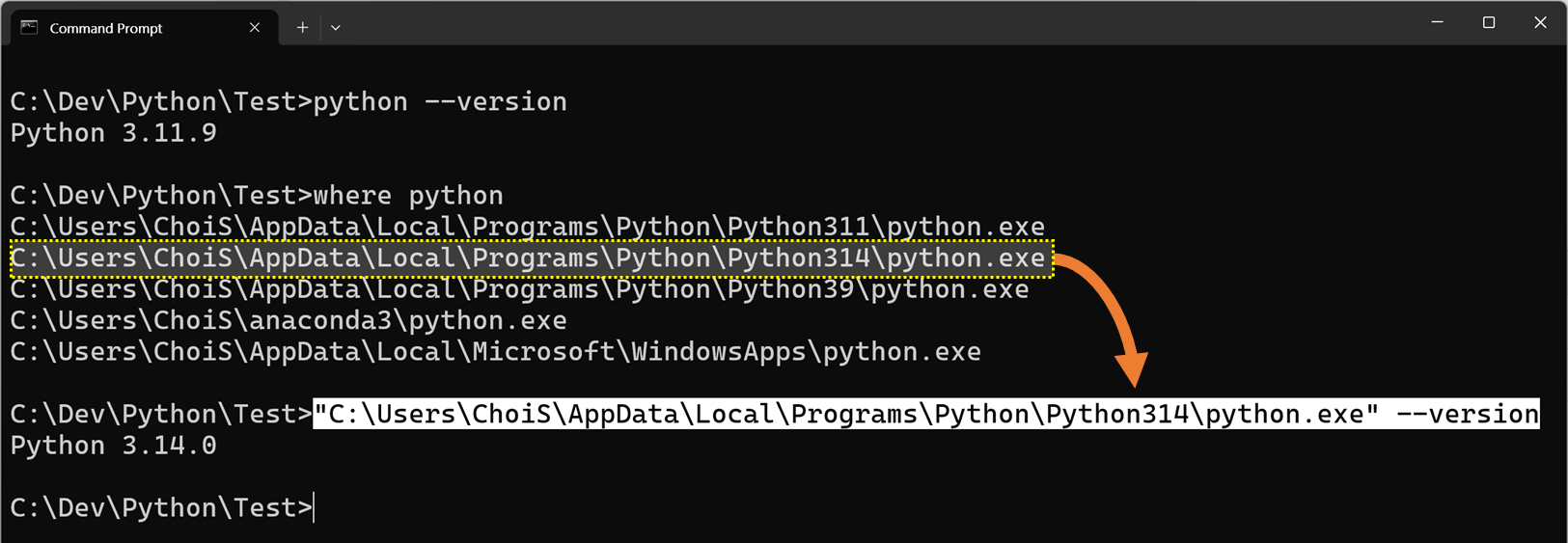 현제 파이썬 3.14, 3.9, 3.11 버전이 동시에 설치되어 있습니다.