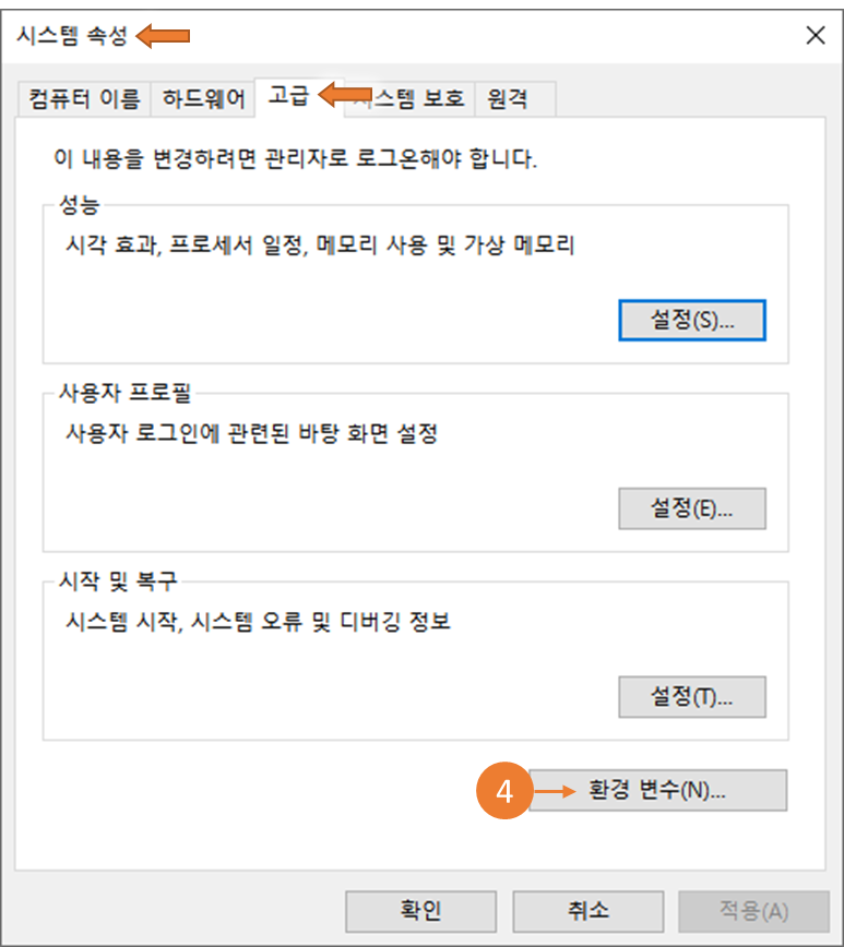 3. [시스템 속성] → [고급 탭] → [환경 변수] 로 이동