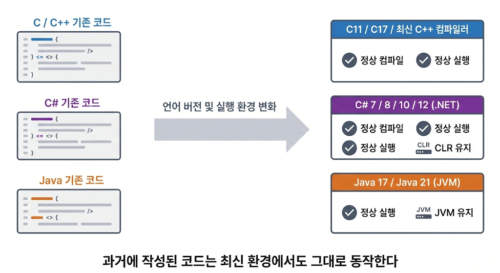 C# 7, 8, 10, 12에서도 그대로 컴파일됨, CLR(.NET 런타임)이 과거 버전 코드를 거의 영구적으로 유지 지원.