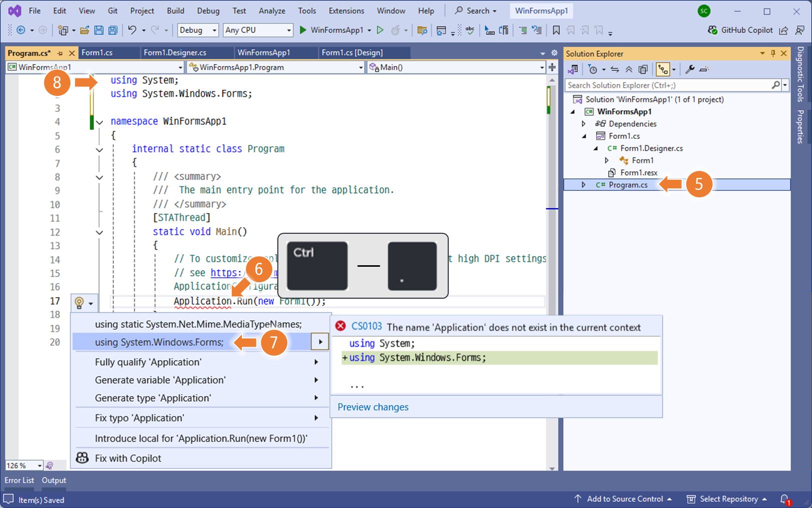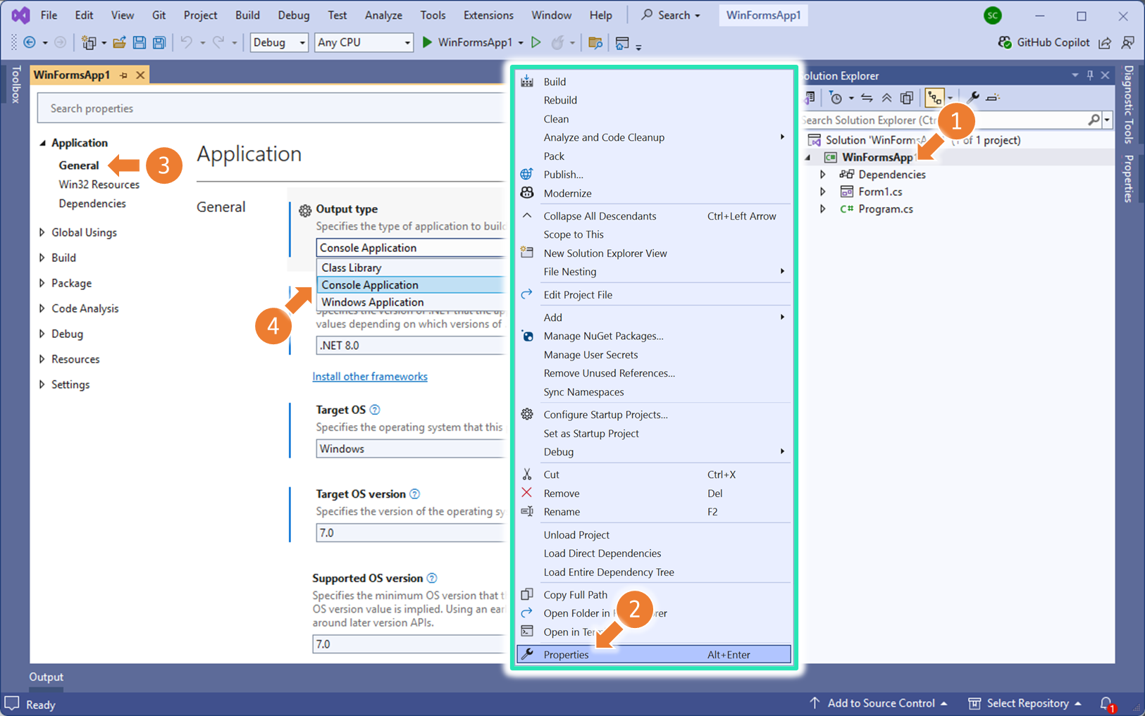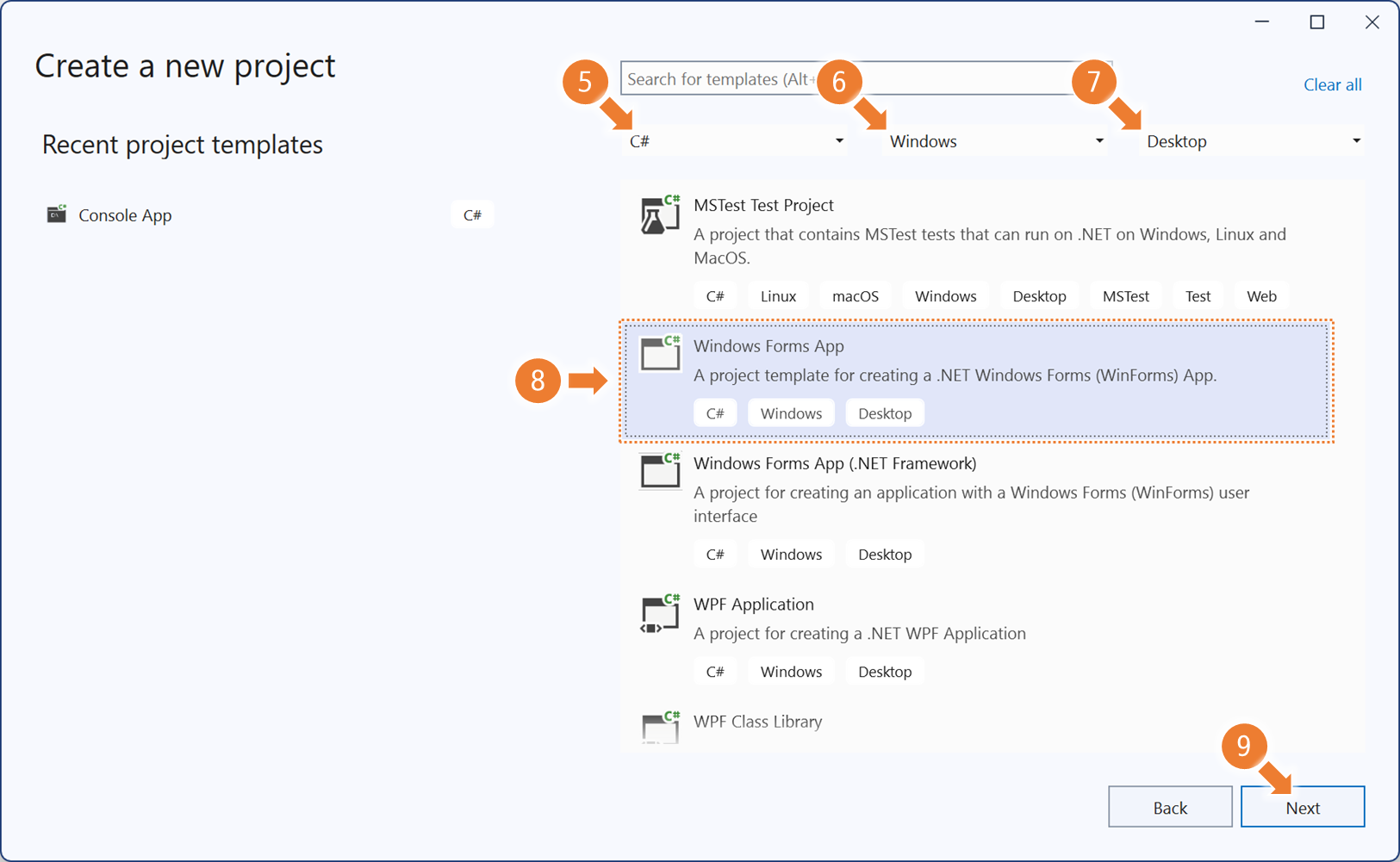 Visual Studio C# 윈폼 프로젝트 생성하기 2023.03.07 11:21 C# - WPF/Network VS C# 윈폼 프로젝트 생성하기 더보기 윈도우에서 비주얼 스튜디오를 검색하여 실행합니다. 새 프로젝트를 생성 버튼을 클릭합니다. 프로그래밍 언어, 플랫폼, 프로젝트 탬플릿을 선택하고, Window Forms App 템플릿을 선택합니다. 프로젝트 이름과, 프로젝트 경로를 선택합니다. 프레임워크를 선택하고, top-level statements 사용 안함 체크 후 프로젝트를 생성합니다. 추가 설정 1 더보기 프로젝트 속성에서, 글로벌 유징을 비활성화 합니다. 학습을 위해 전역 using을 비활성화하고, 네임스페이스를 수동으로 관리합니다. 추가 설정 2 더보기 윈폼에서 콘솔 출력창이 동시에 실행되도록 합니다. 공유하기 게시글 관리 BasicLike 댓글 공유하기 다른 글 댓글 이 글 공유하기 구독하기 구독하기 카카오톡 카카오톡 라인 라인 트위터 트위터 Facebook Facebook 카카오스토리 카카오스토리 밴드 밴드 네이버 블로그 네이버 블로그 Pocket Pocket Evernote Evernote 다른 글 Visual Studio C# 콘솔 프로젝트 생성하기 Visual Studio C# 콘솔 프로젝트 생성하기 2023.03.20 외부 프로젝트 솔루션에 추가하기 외부 프로젝트 솔루션에 추가하기 2023.03.20 C# 클래스 라이브러리 생성하기 C# 클래스 라이브러리 생성하기 2023.03.04 프로젝트에 클래스 파일 추가하기 프로젝트에 클래스 파일 추가하기 2023.02.24 다른 글 더 둘러보기