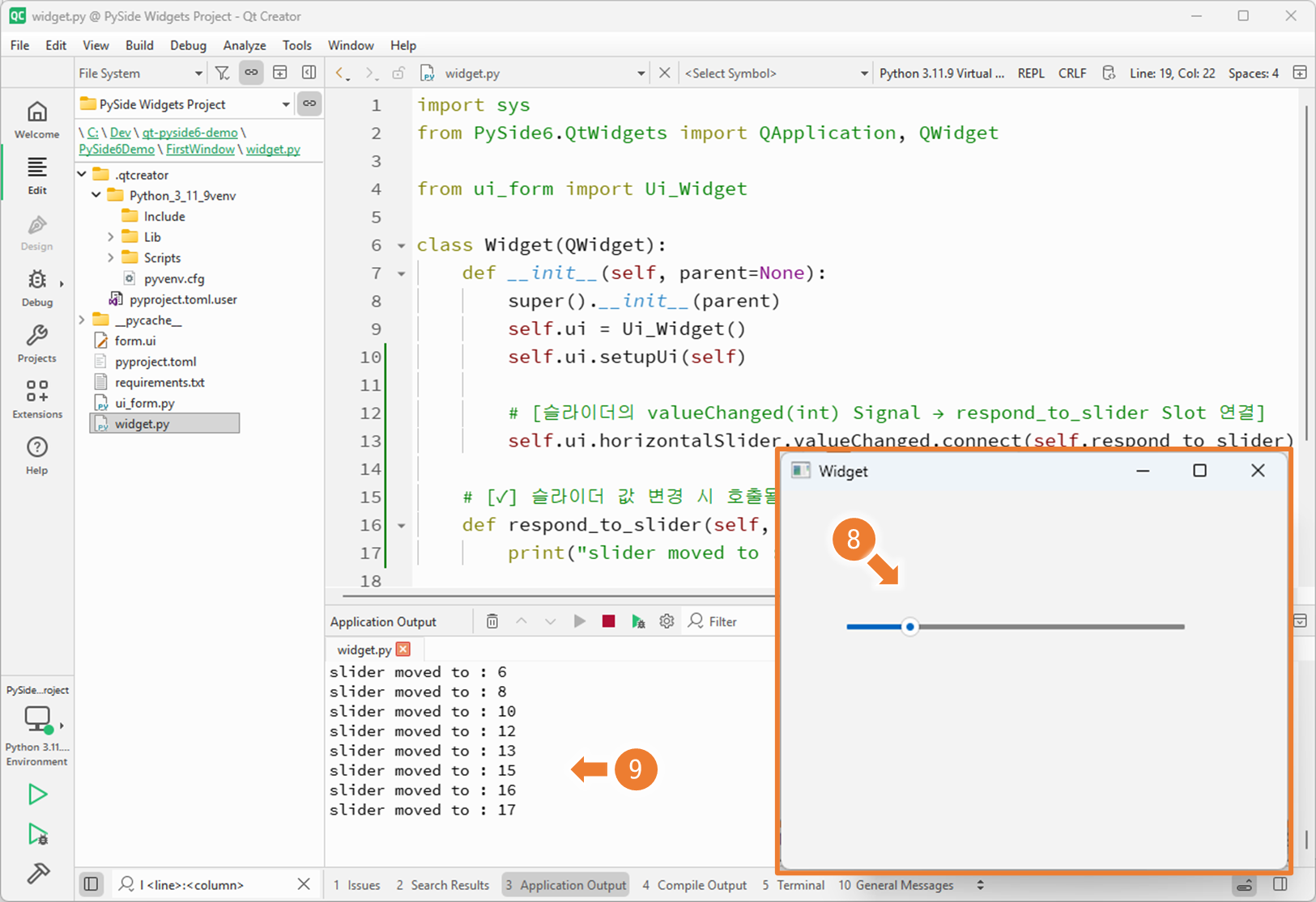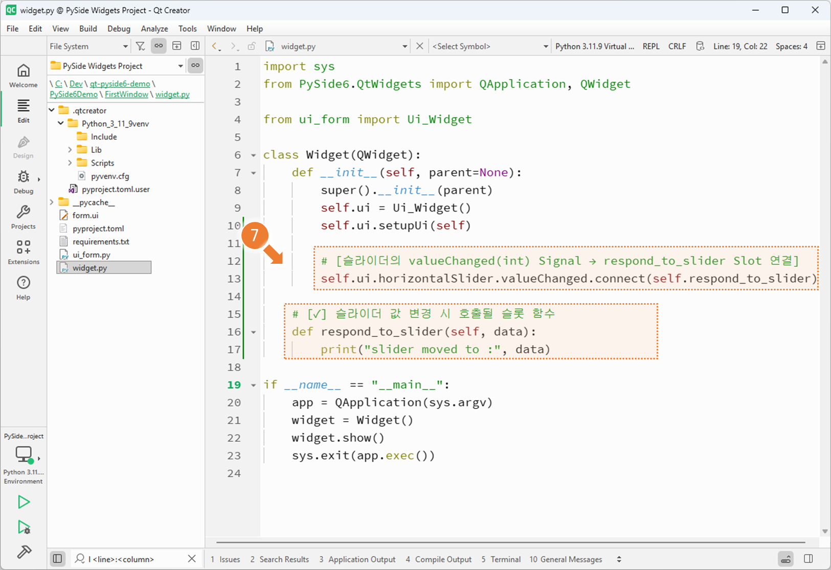 # [슬라이더의 valueChanged(int) Signal → respond_to_slider Slot 연결]