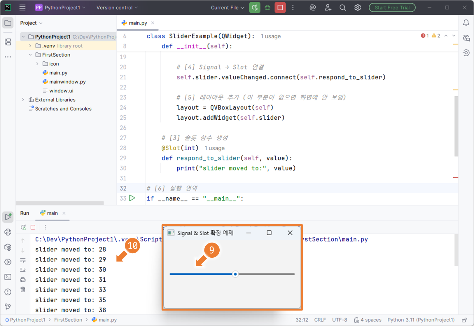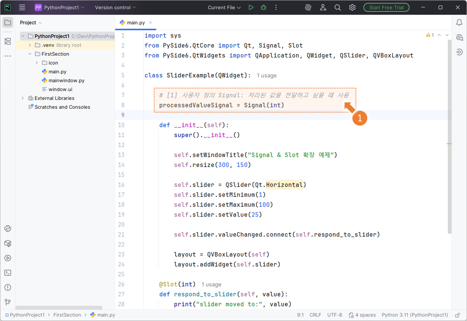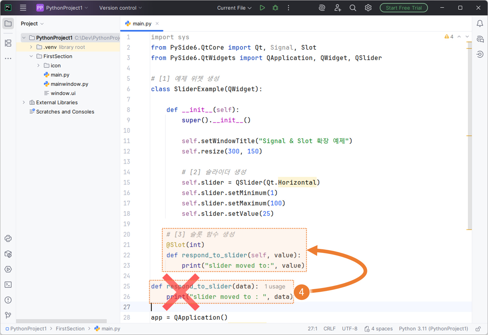 Signal이 int를 보내는데 Slot이 str 받으면 오류 가능→ @Slot(int) 로 명확하게 문서화 및 검증 - 대규모 프로젝트에서 유지보수 용이