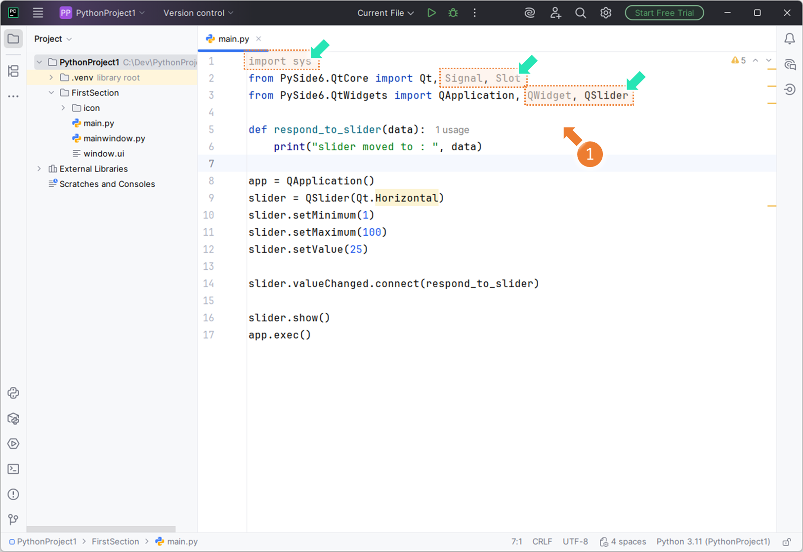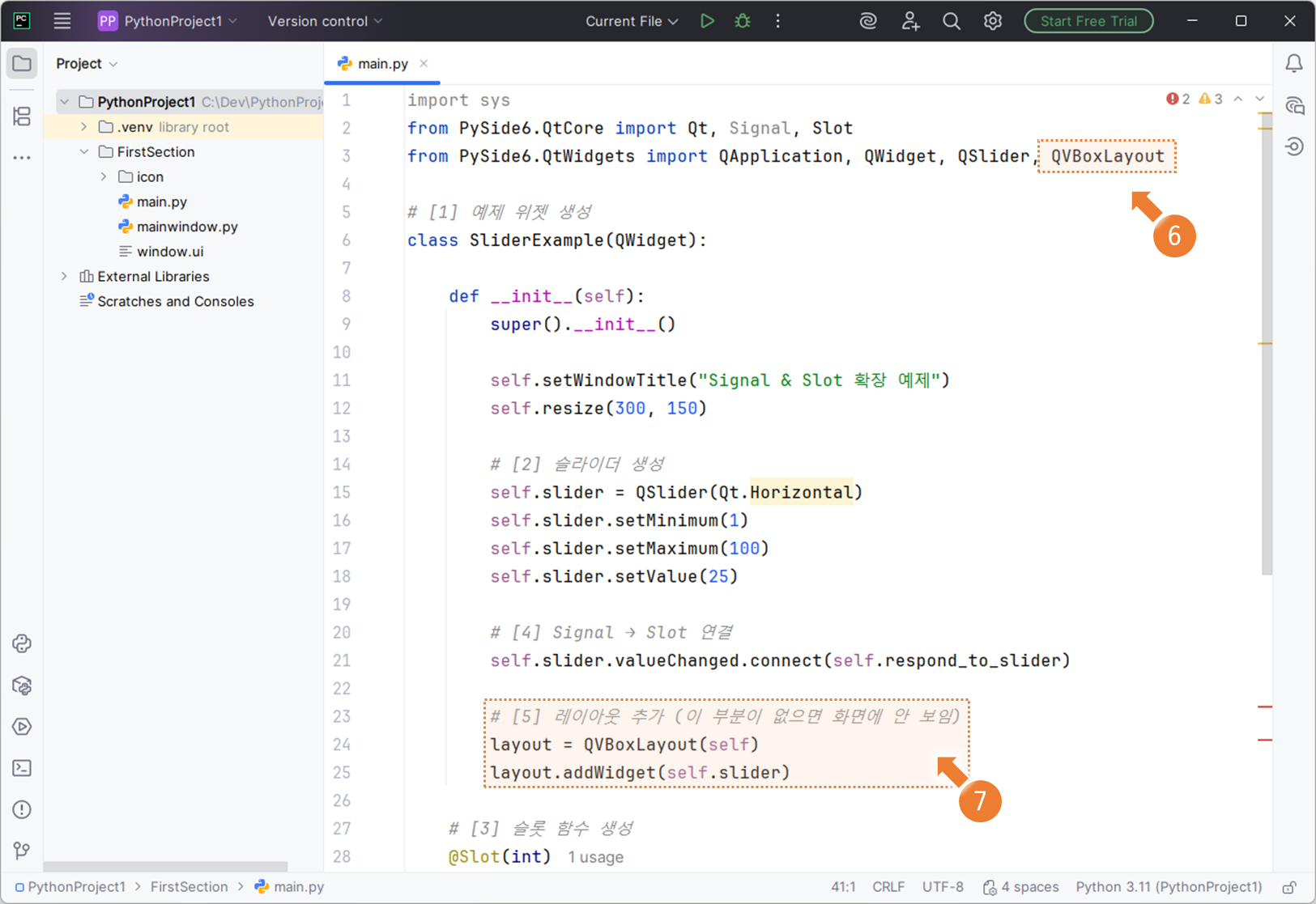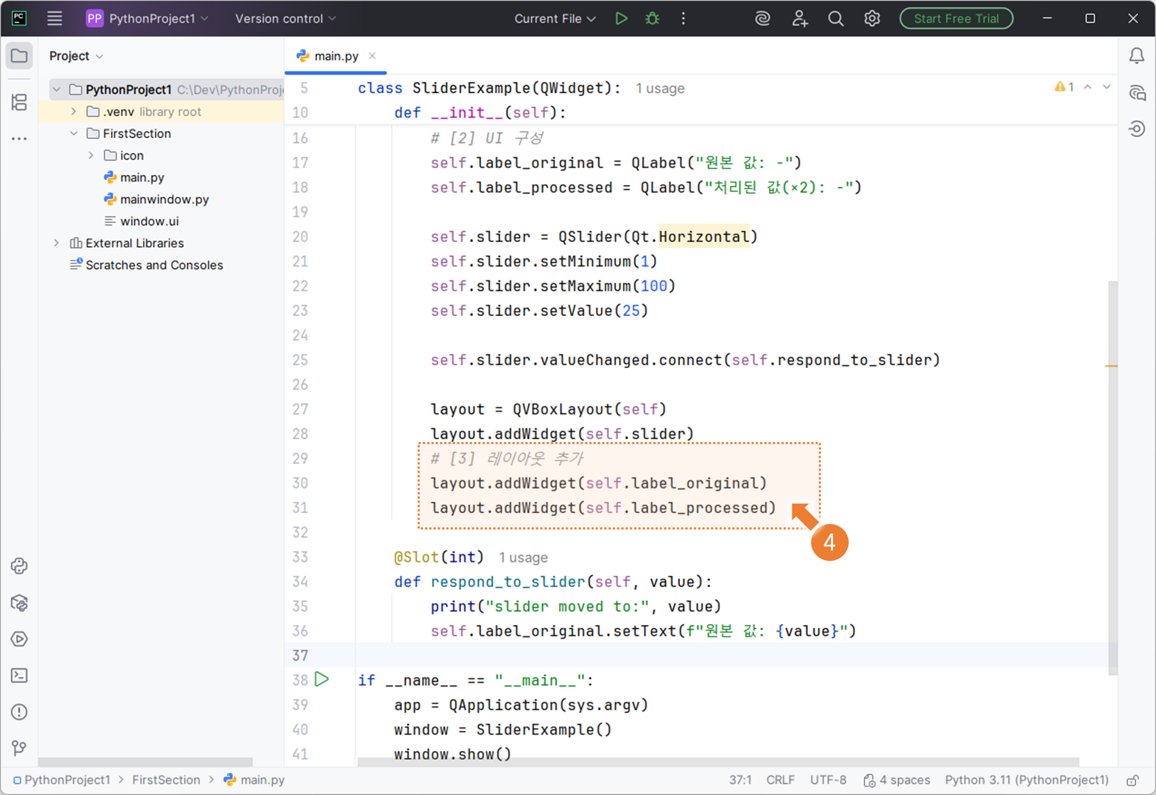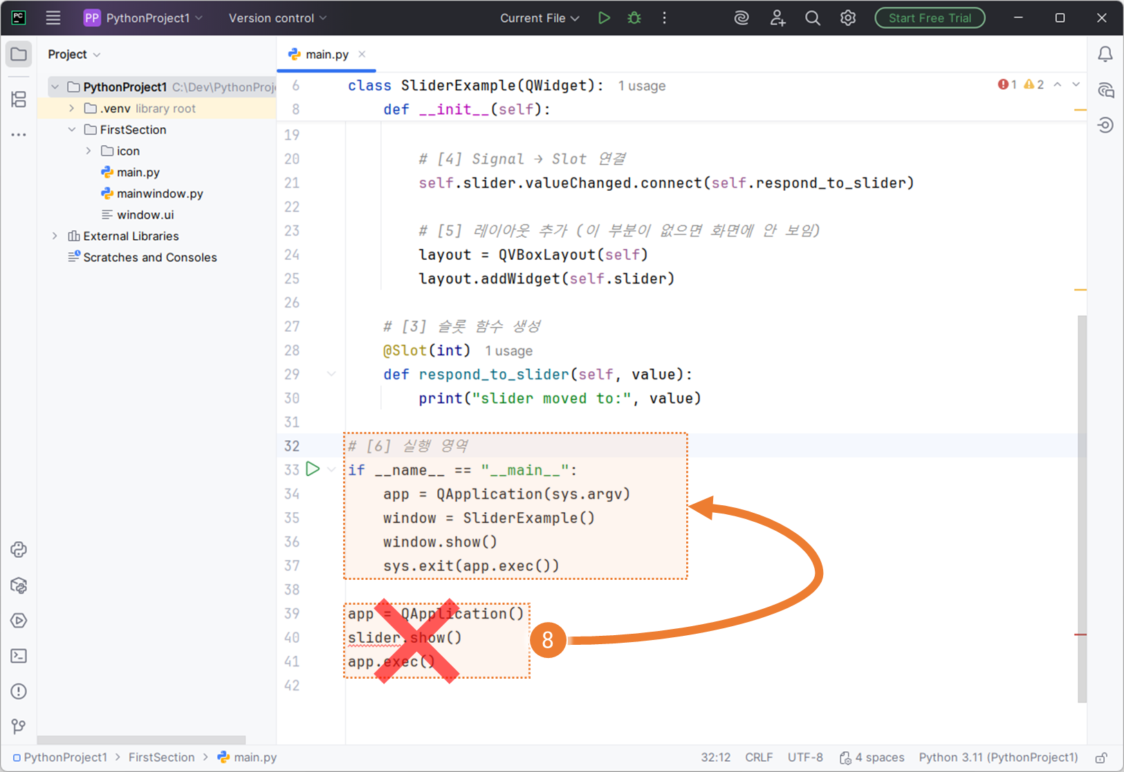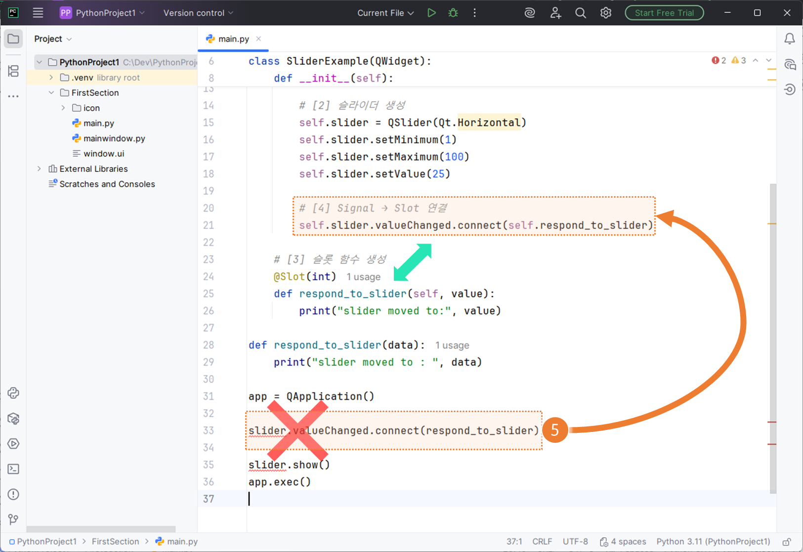 → @Slot(int) 적극 활용 - 사용자 정의 Signal이 많을 경우→ Signal(int, str ...) → @Slot(int, str) 맞춰 쓰기(버그 예방)