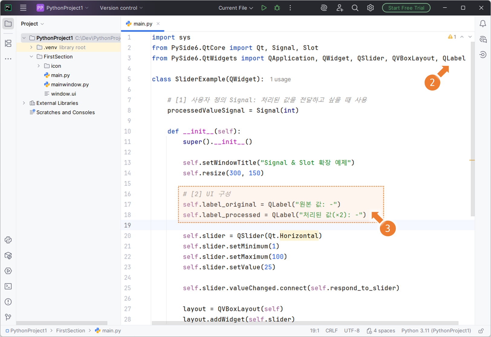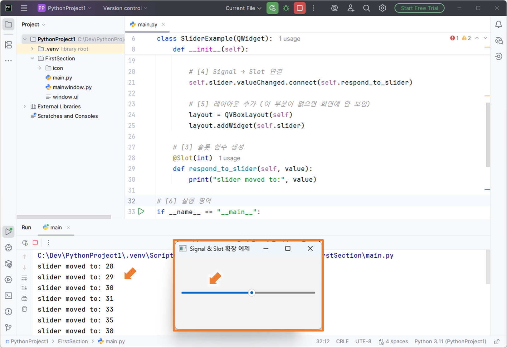 1. 학습 목표 (Learning Objectives):슬라이더(QSlider) 위젯을 사용해 Signal/Slot 구조를 이해더보기슬라이더(QSlider)의 valueChanged(int) Signal 구조 이해Slider가 Signal을 발생시키며 “값(data)”을 Slot 함수에 자