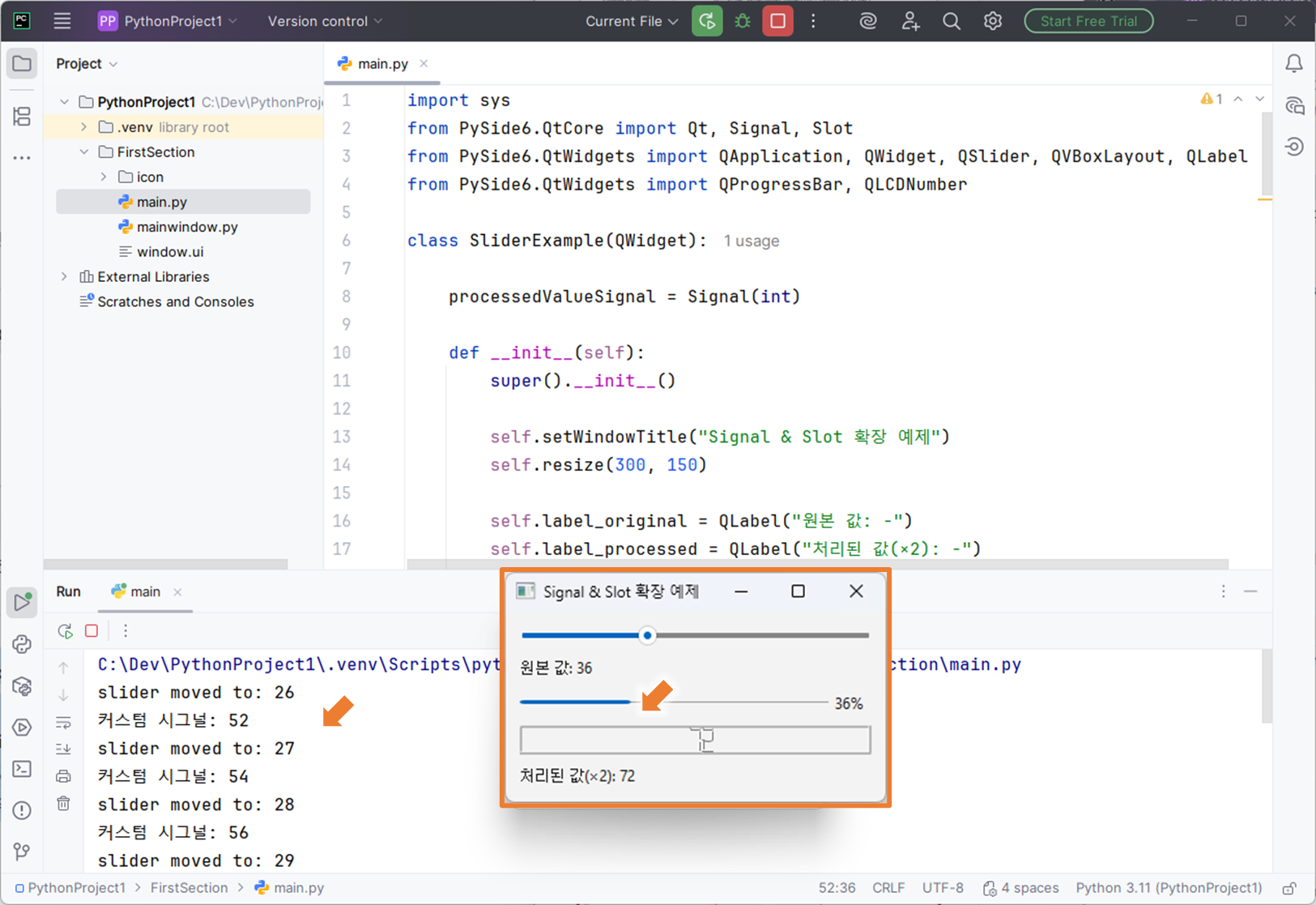 self.setWindowTitle("Signal & Slot 확장 예제")