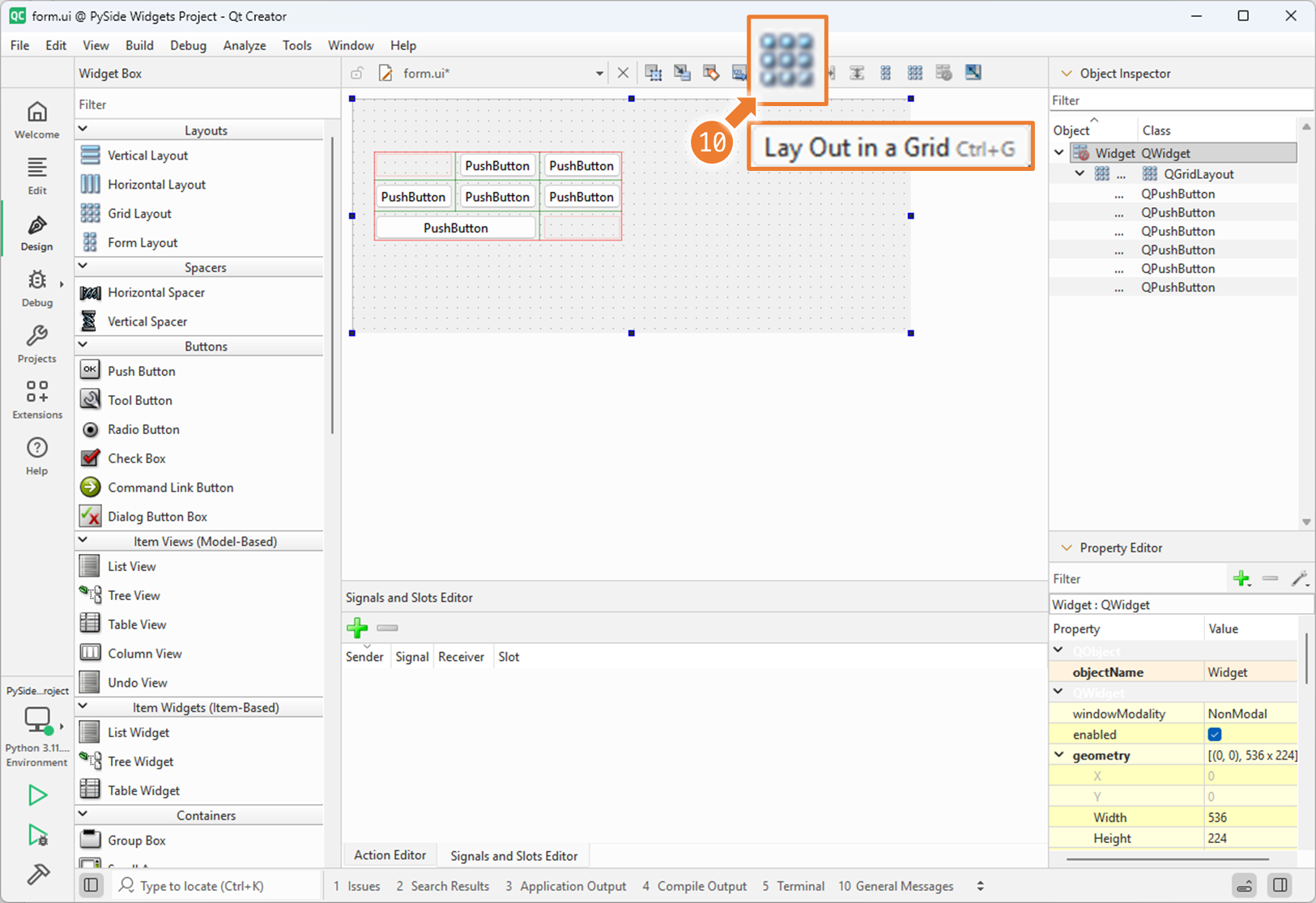 2. Qt Designer 에서 QGridLayout 사용하기 (1)