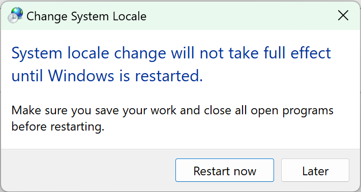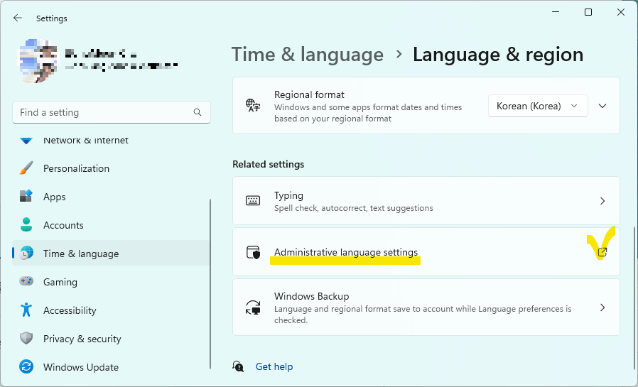 2. Region → Administrative → Copy settings... 또는 Change system locale... 을 수정해야 한다.