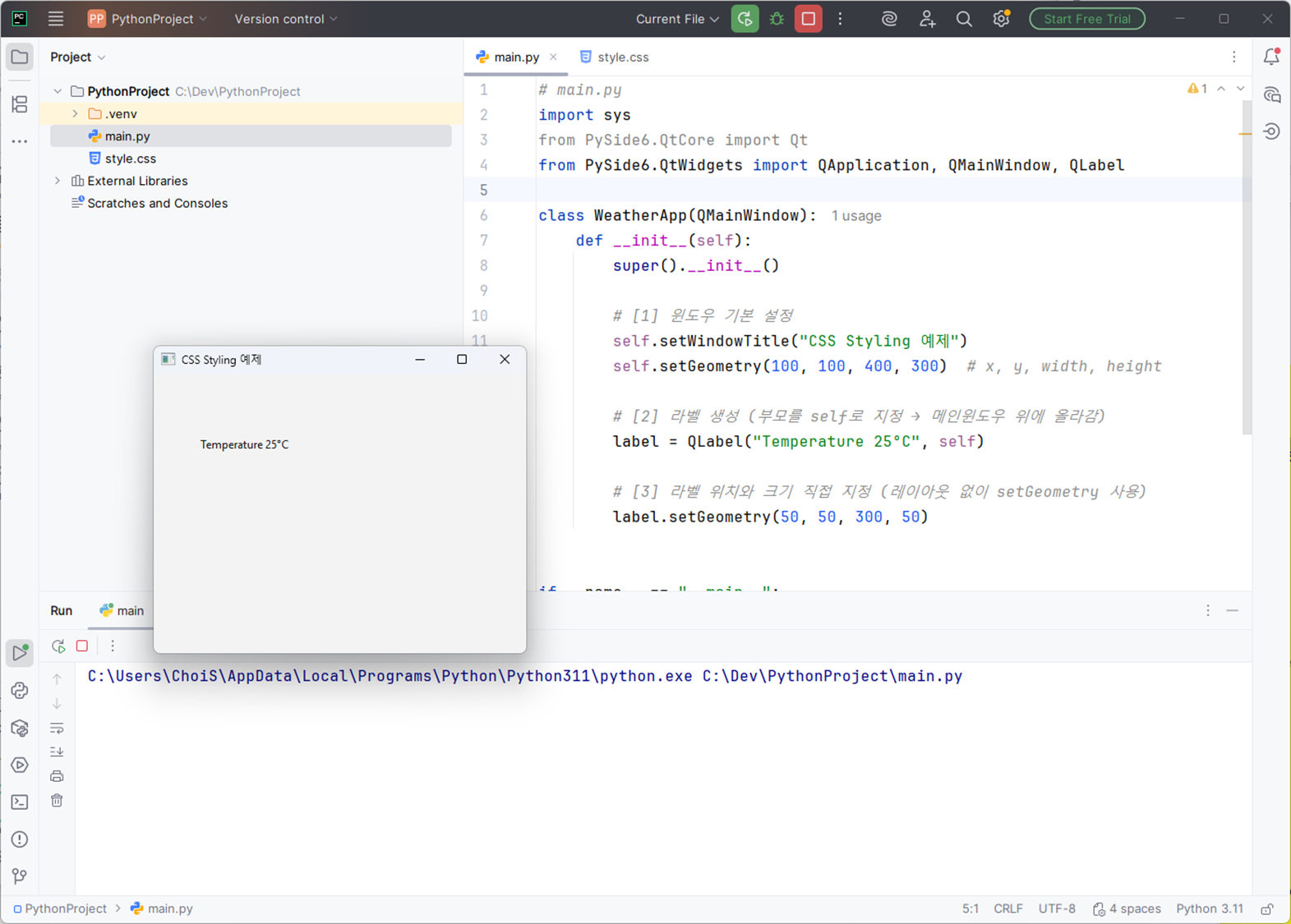 - main.py : PySide6 앱, QMainWindow, QLabel, CSS 적용 코드