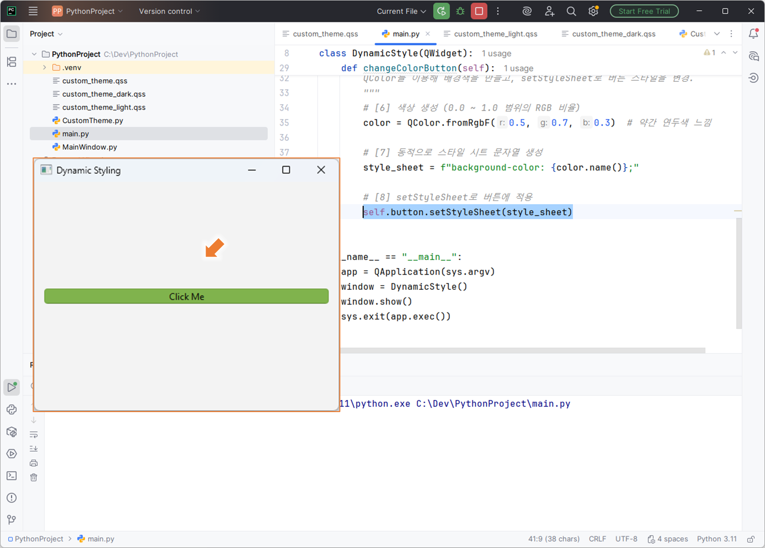 *여기서 핵심이 바로 setStyleSheet( )를 실행 중에 호출해 스타일을 바꾸는 것 = Dynamic Styling