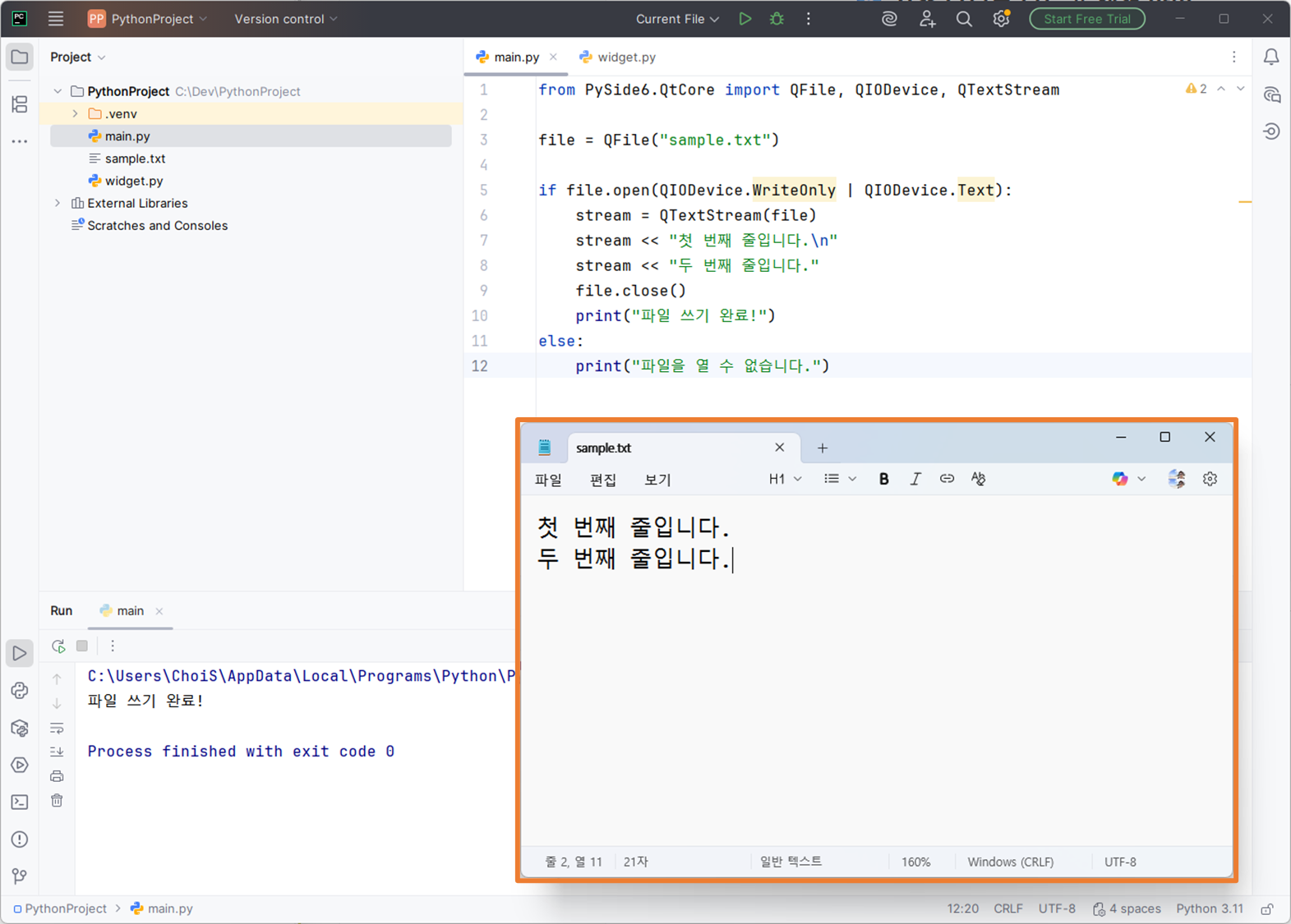 | QIODevice.WriteOnly | 쓰기 전용 (기존 내용 덮어씀) |