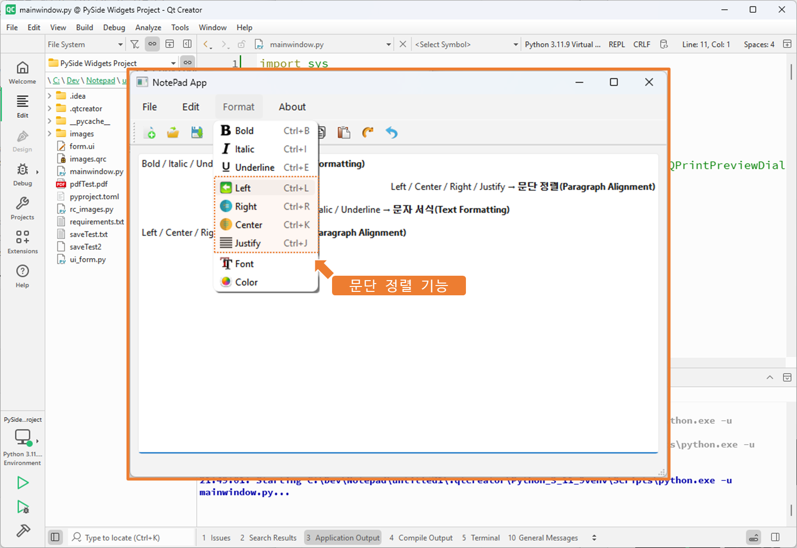 PySide6 QTextEdit 위젯에 다음 네 가지 문단 정렬 기능을 구현하고 연습한다.