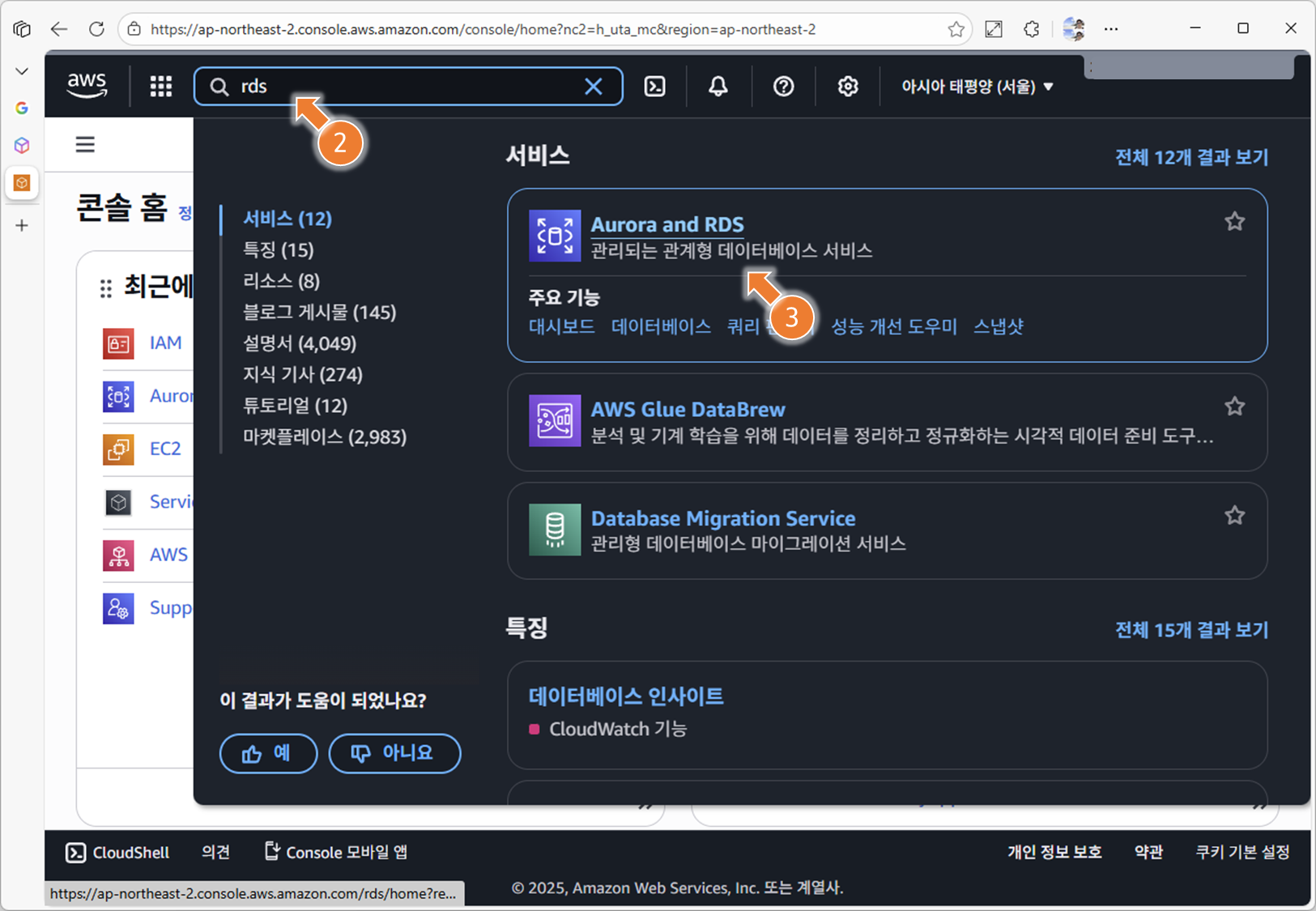 상단 검색창에 “RDS” 입력 후, Auroara And RDS 대시보드로 이동