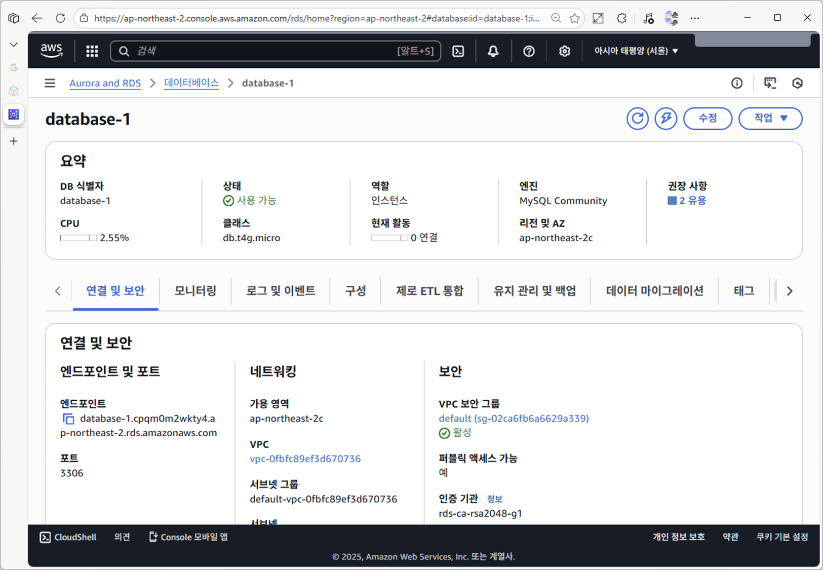 | Connectivity & security | Endpoint, VPC, Subnet, 보안 그룹, 포트 정보 |