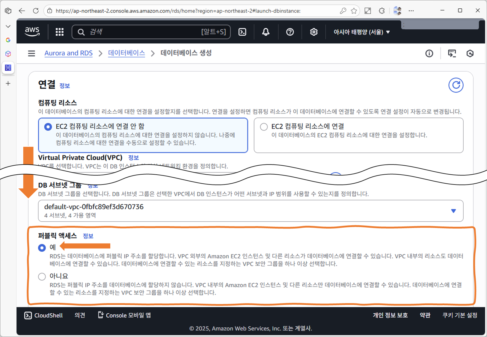 9. [생성 7단계] Connectivity – VPC, Public access, Port 설정