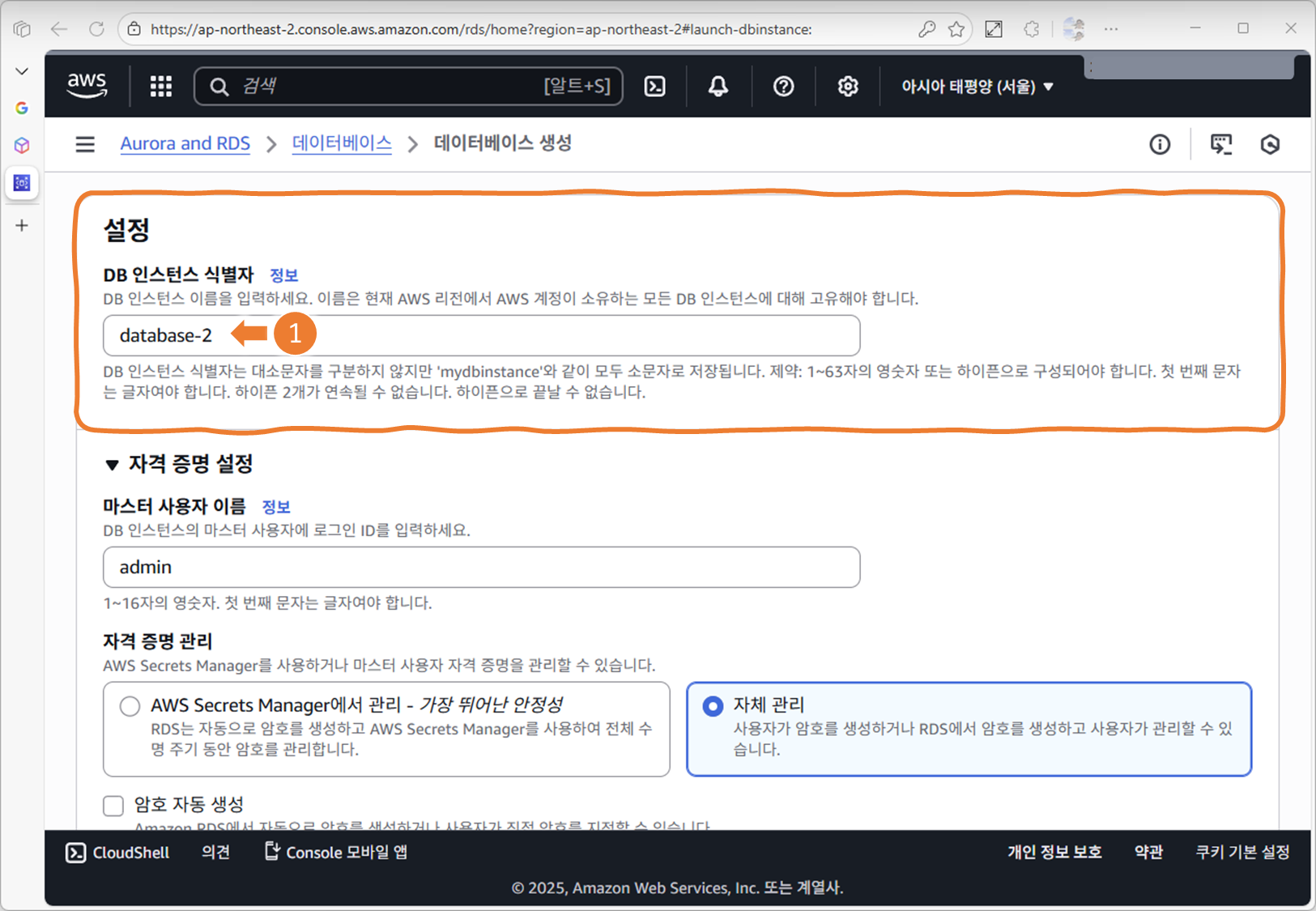 - DB 인스턴스 이름 / 계정 / 비밀번호 설정