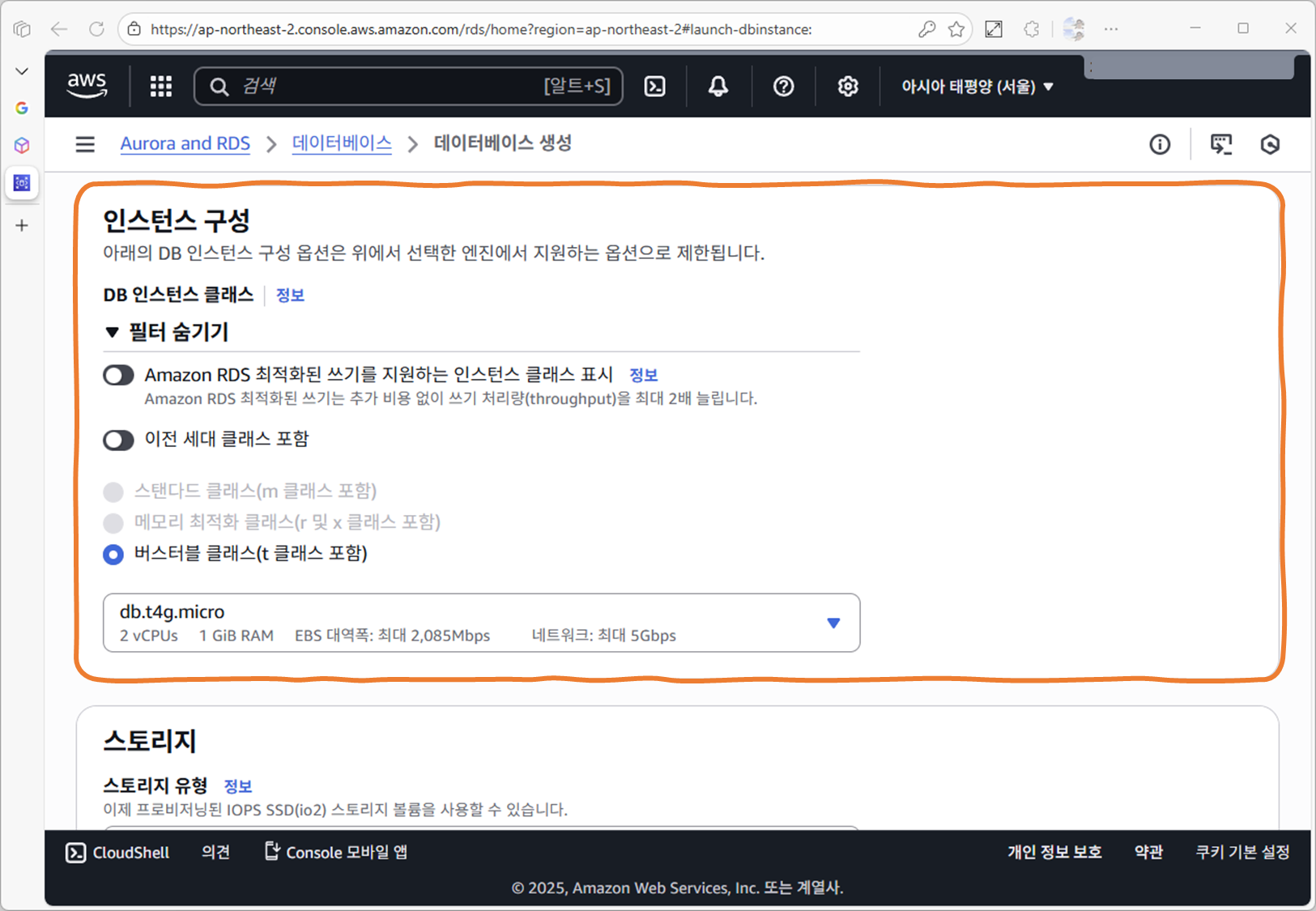 - db.t3.micro 또는 db.t4.micro 정도가 자동 선택/고정됩니다.