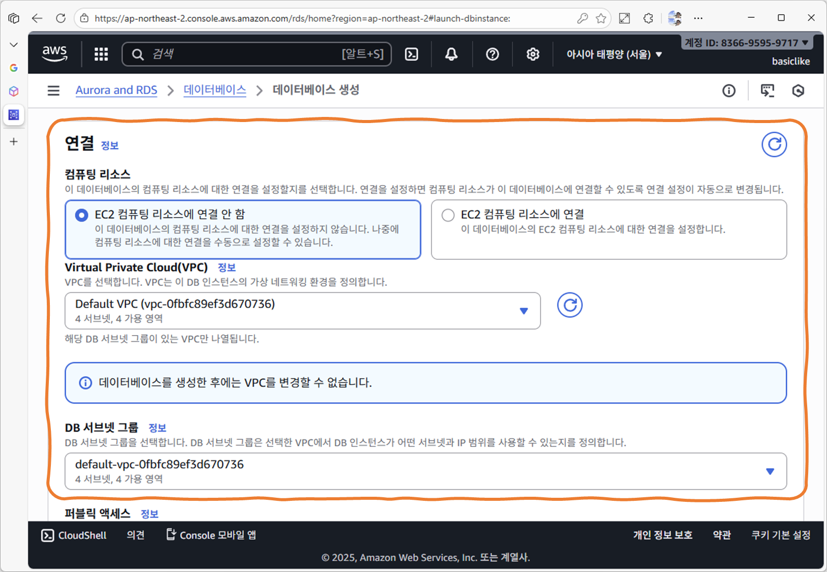- 기본 VPC 사용 (Default VPC)