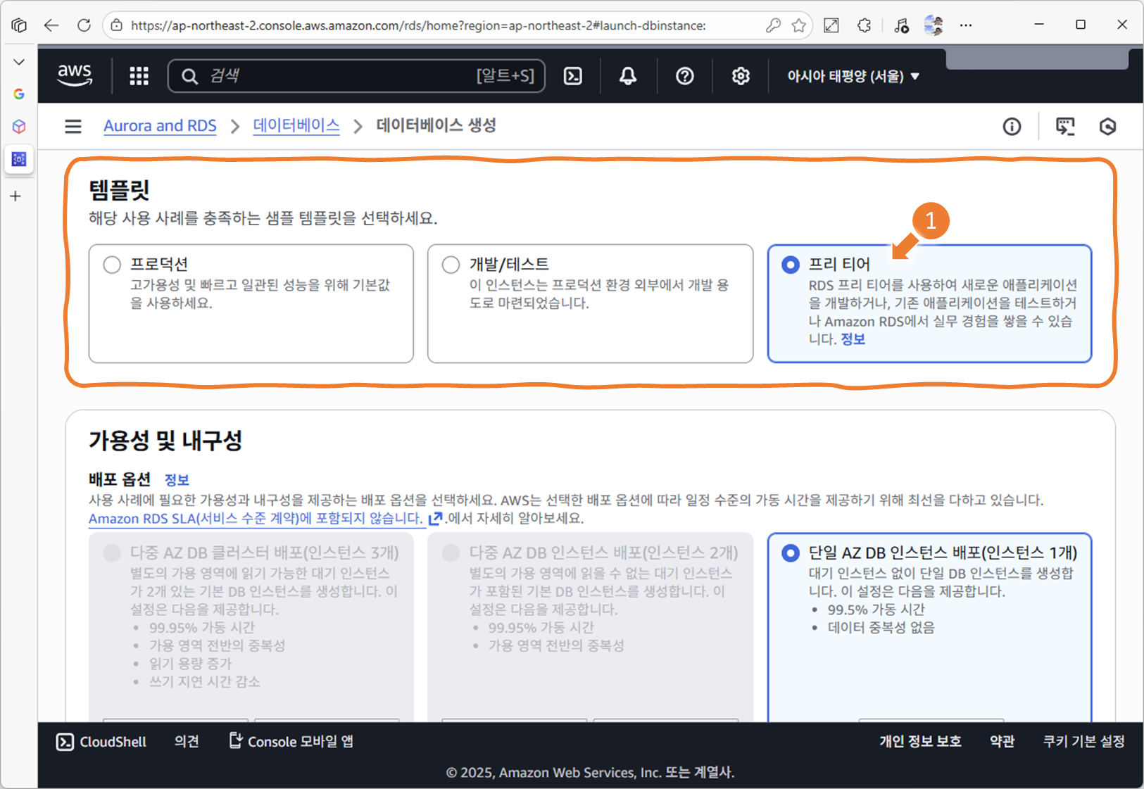 - Production 선택 시: 고가용성, Multi-AZ 등 옵션 가능(하지만 비용↑)