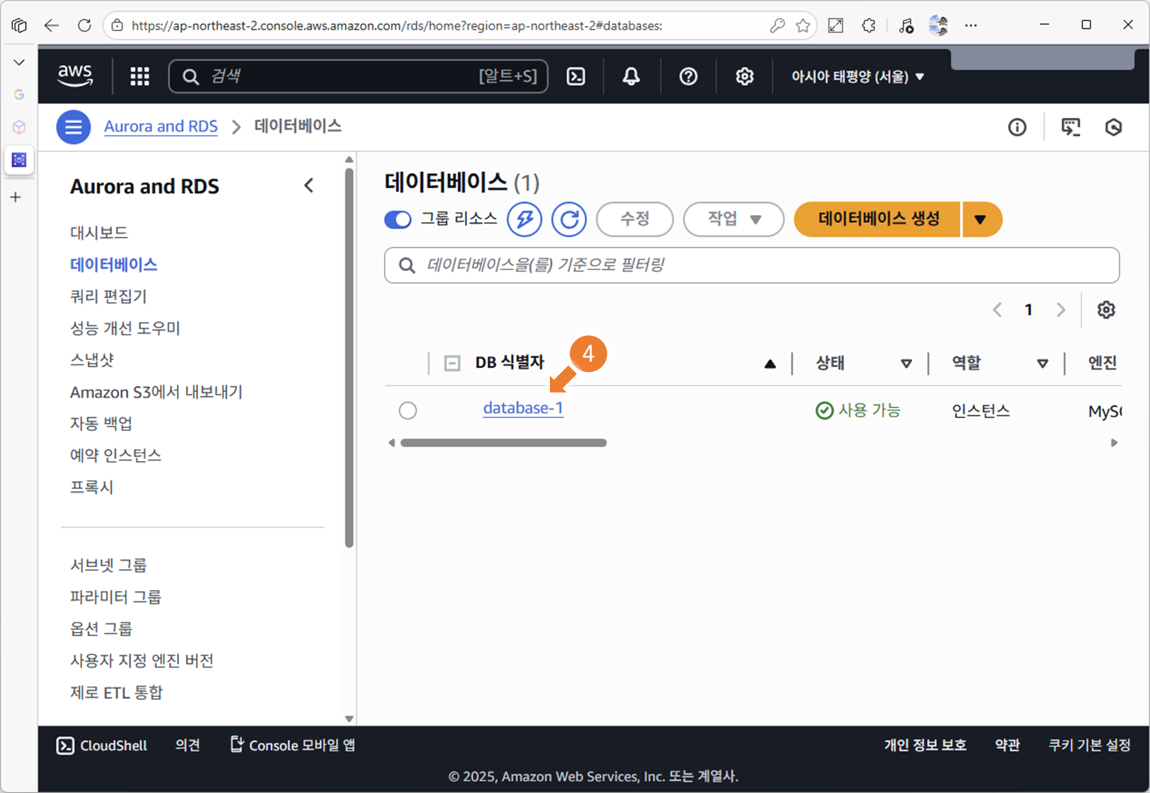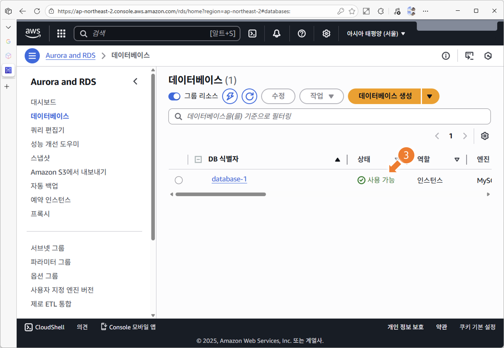 RDS → Databases 목록에서 방금 만든 DB 인스턴스를 확인합니다.