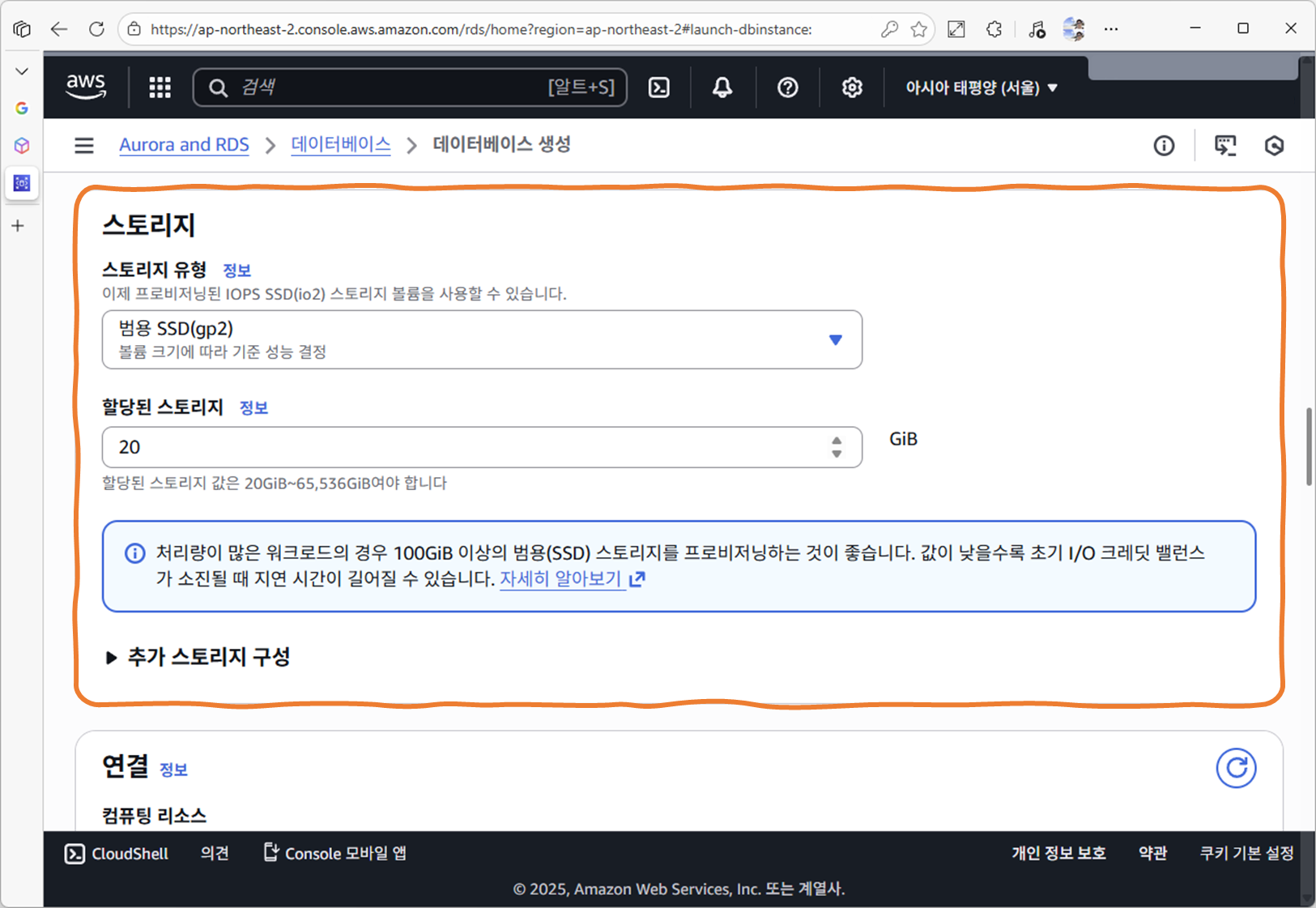 👉 General Purpose SSD(gp2/gp3) 선택 (기본값)