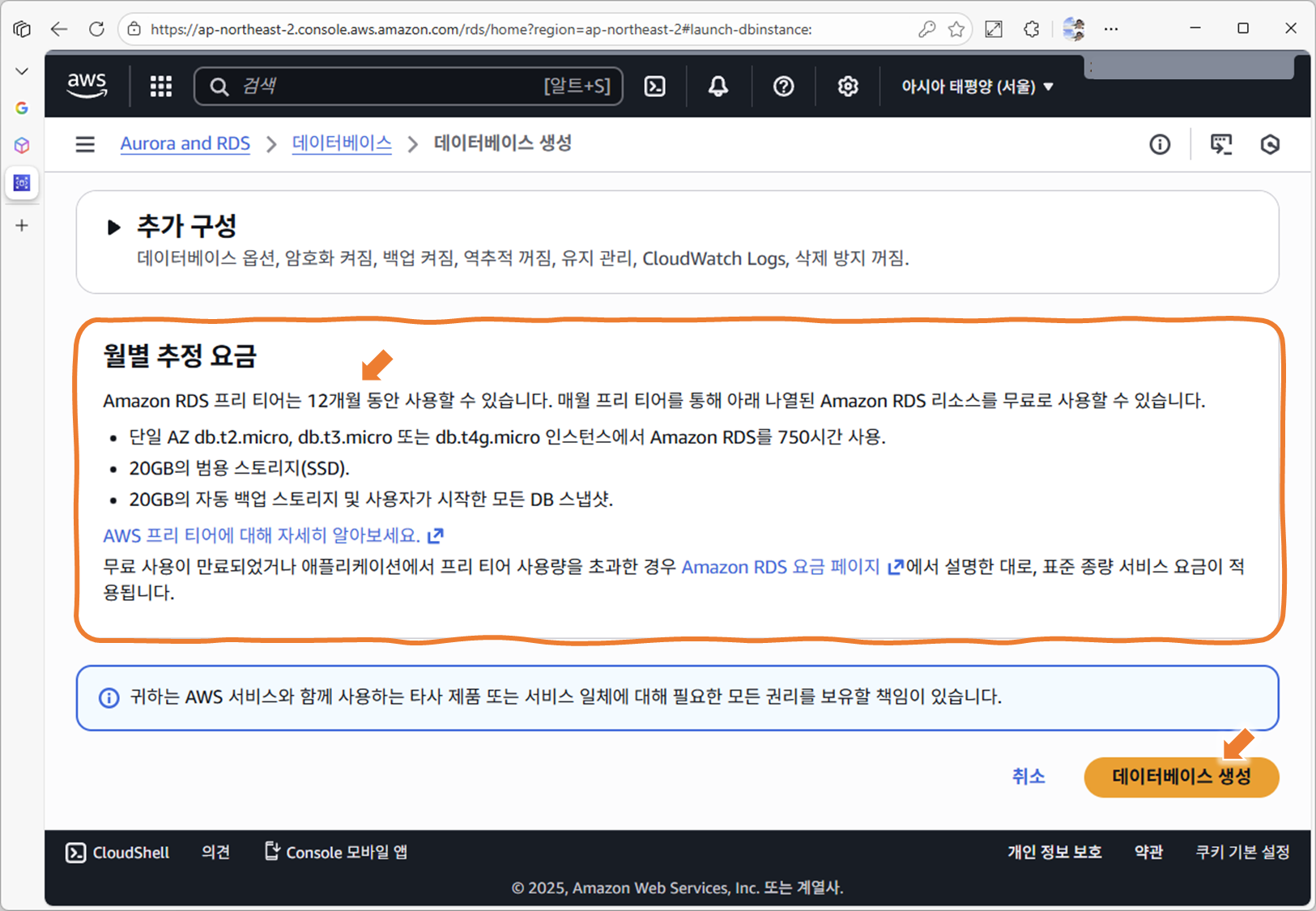 10. [생성 8단계] 나머지 옵션은 기본값 유지 → Create database