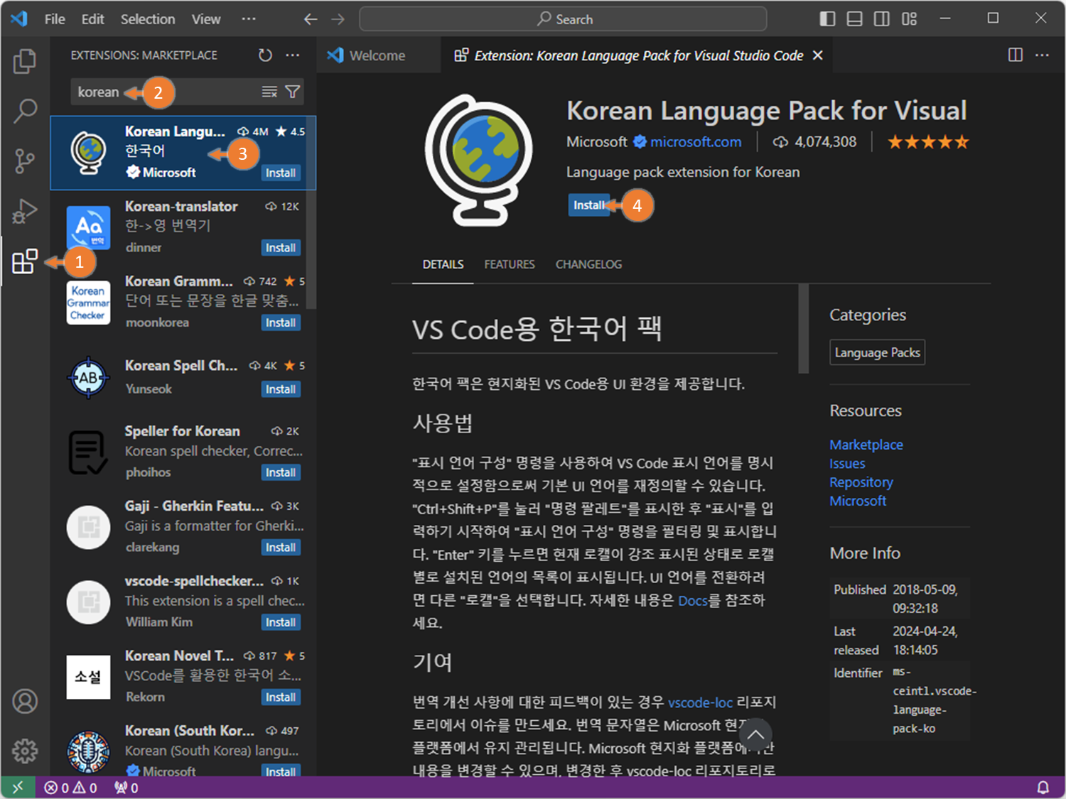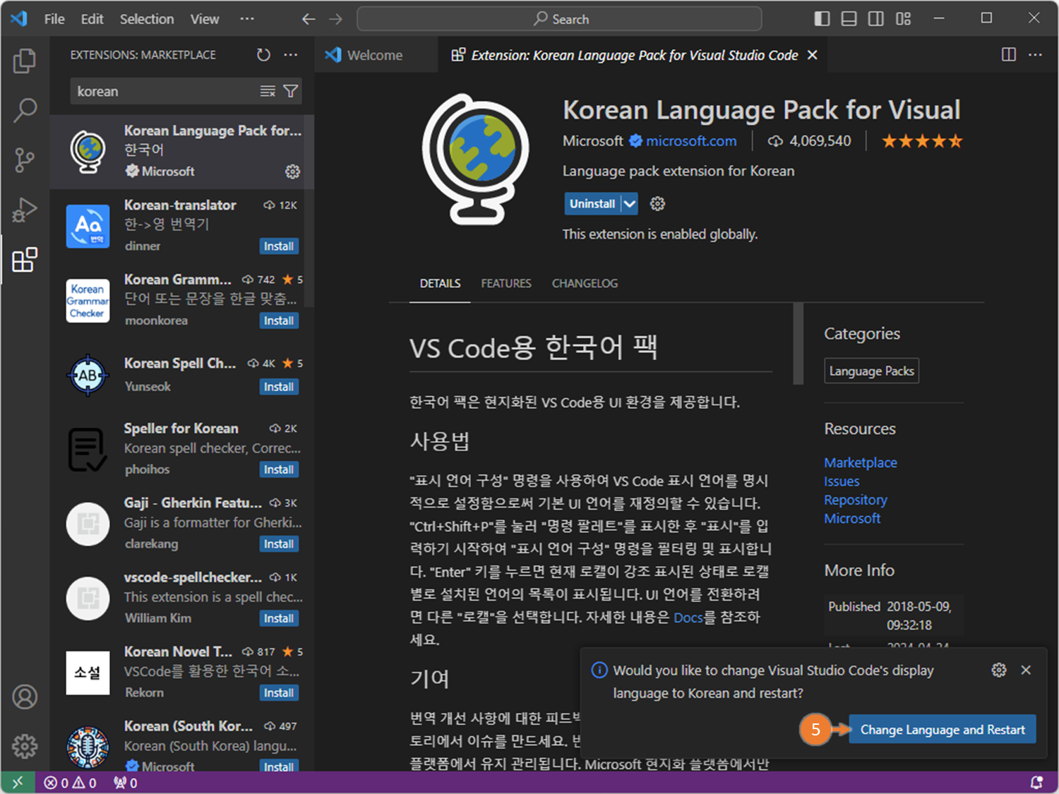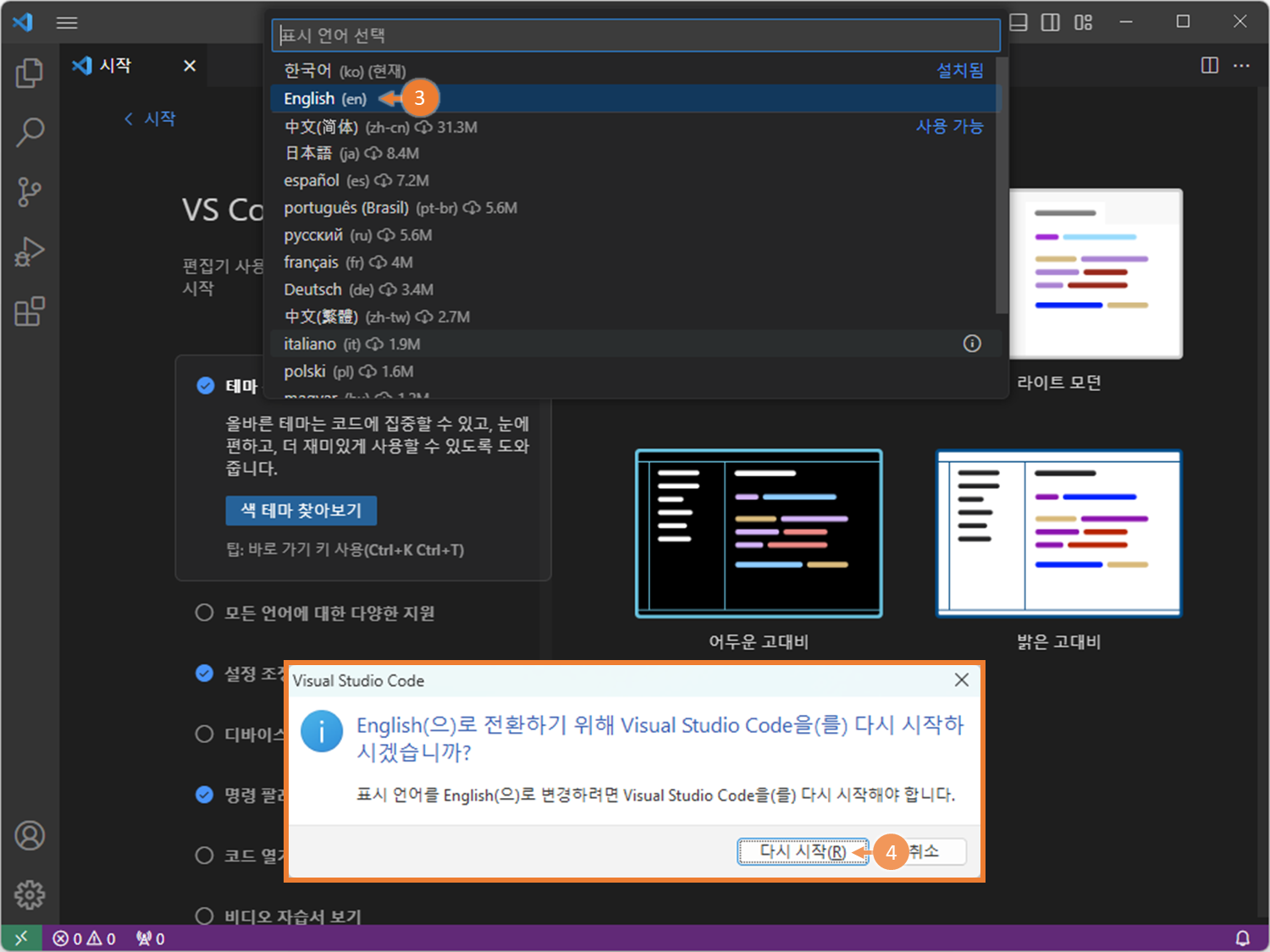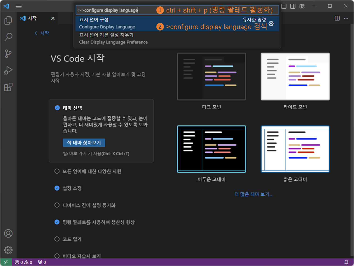 VSCode 한국어 설정 2023.03.12 17:00 C, C++/Setup&Tips 1. 한국어 팩 설치 2. VS Code 재실행 3. 언어 변경 확인 VS Code 언어 선택 >configure display language 공유하기 게시글 관리 BasicLike 댓글 공유하기 다른 글 댓글 이 글 공유하기 구독하기 구독하기 카카오톡 카카오톡 라인 라인 트위터 트위터 Facebook Facebook 카카오스토리 카카오스토리 밴드 밴드 네이버 블로그 네이버 블로그 Pocket Pocket Evernote Evernote 다른 글 콘솔 글자색, 배경색 수정(2) - Win, Linux 콘솔 글자색, 배경색 수정(2) - Win, Linux 2023.07.10 콘솔 글자색, 배경색 수정(1) - Win11 콘솔 글자색, 배경색 수정(1) - Win11 2023.07.10 <Win> VSCode - 한글 깨짐(2) - 폰트 이슈 <Win> VSCode - 한글 깨짐(2) - 폰트 이슈 2023.03.26 <Win> VSCode - 한글 깨짐(1) - 인코딩 문제 <Win> VSCode - 한글 깨짐(1) - 인코딩 문제 2023.03.26 다른 글 더 둘러보기